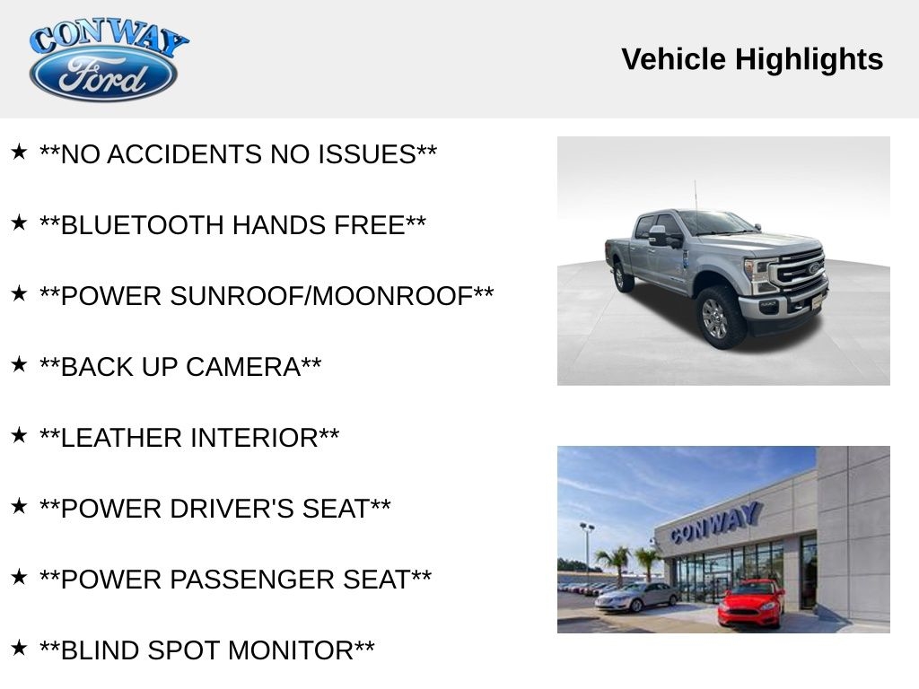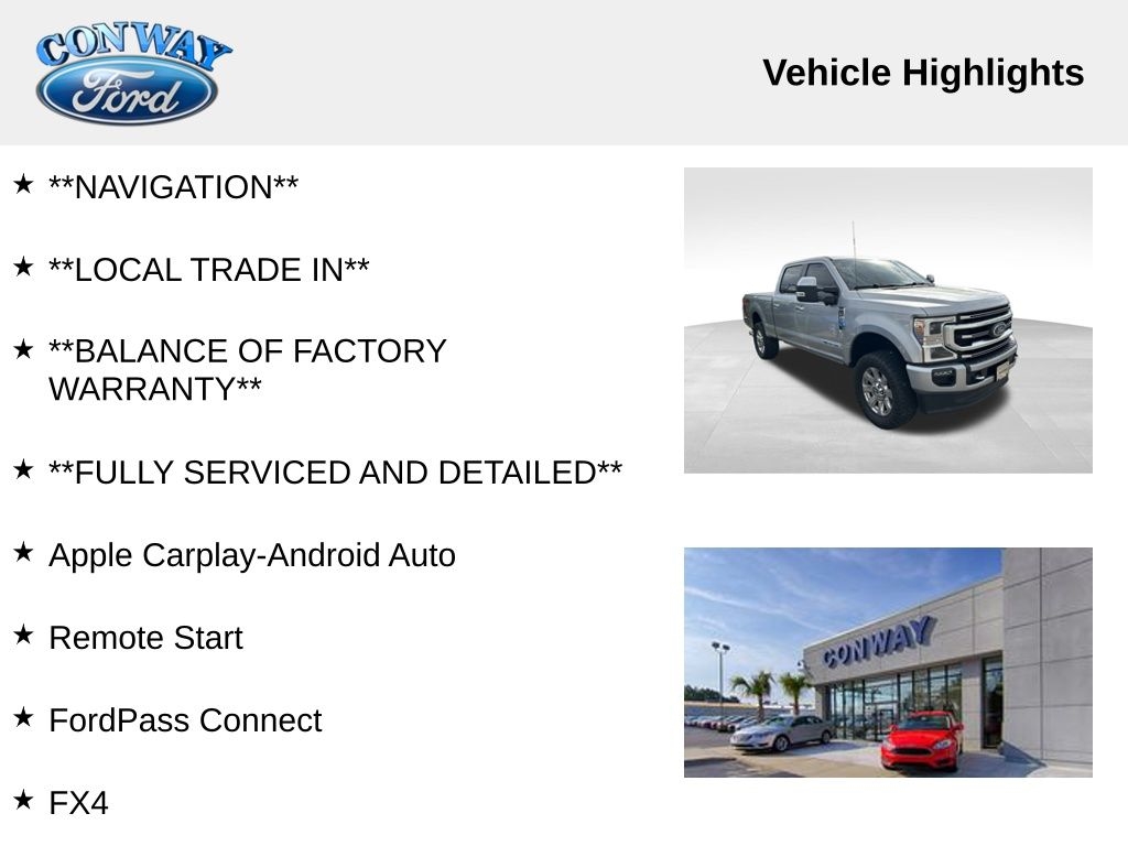 **NO ACCIDENTS NO ISSUES**, **BLUETOOTH HANDS FREE**, **POWER SUNROOF/MOONROOF**, **BACK UP CAMERA**, **LEATHER INTERIOR**, **POWER DRIVER'S SEAT**, **POWER PASSENGER SEAT**, **BLIND SPOT MONITOR**, **NAVIGATION**, **LOCAL TRADE IN**, **BALANCE OF FACTORY WARRANTY**, **FULLY SERVICED AND DETAILED**, Apple Carplay-Android Auto, Remote Start, FordPass Connect, FX4, Adaptive Steering, Panoramic Sunroof, Power Running Boards, Adaptive Cruise Control, B&O Sound System, ULT TRILER TOW CAMERA SYS W/ PRO T, F-250SD Platinum, 4D Crew Cab, Power Stroke 6.7L V8 DI 32V OHV Turbodiesel, 4WD, 10 Speakers, 110V/400W Outlet, 20" Premium Painted Wheels, 397 Amp Alternator, 4-Wheel Disc Brakes, 5th Wheel/Gooseneck Hitch Prep Package, ABS brakes, Adaptive Cruise Control, Adaptive Steering, Adjustable pedals, Air Conditioning, AM/FM radio: SiriusXM, Auto High-beam Headlights, Automatic temperature control, Brake assist, Compass, Delay-off headlights, Driver door bin, Driver vanity mirror, Dual front impact airbags, Dual front side impact airbags, Dual Zone Auto A/C, Electronic Stability Control, Electronic-Locking w/3.31 Axle Ratio, Exterior Parking Camera Rear, Flow-Through Console, Front fog lights, Front Leather Seating Surfaces 40/Console/40, Front reading lights, Fully automatic headlights, FX4 Off-Road Package, GVWR: 10,000 lb Payload Package, Heated door mirrors, Heated Steering Wheel, Hill Descent Control, Illuminated entry, Lane-Keeping Alert, Leather steering wheel, Low tire pressure warning, Memory Power-Adjustable Pedals, Memory seat, Navigation System, Off-Road Specifically Tuned Shock Absorbers, Order Code 703A, Outside temperature display, Panic alarm, Passenger door bin, Passenger vanity mirror, Power door mirrors, Power driver seat, Power Heated/Ventilated Driver Seat w/Memory, Power passenger seat, Power steering, Power windows, Power-Deployable Running Boards, Pro Trailer Backup Assist, Radio data system, Radio: B&O System by Bang & Olufsen, Rain-Sensing Windshield Wipers, Rapid-Heat Supplemental Cab Heater, Rear Parking Sensors, Rear reading lights, Rear step bumper, Rear window defroster, Remote keyless entry, SiriusXM Radio, Steering wheel mounted audio controls, SYNC 3 Communications & Entertainment System, Tachometer, Telescoping steering wheel, Tough Bed Spray-In Bedliner, Traction control, Trip computer, Turn signal indicator mirrors, Twin Panel Power Moonroof, Ultimate Trailer Tow Camera System, Unique FX4 Off-Road Box Decal, Variably intermittent wipers.