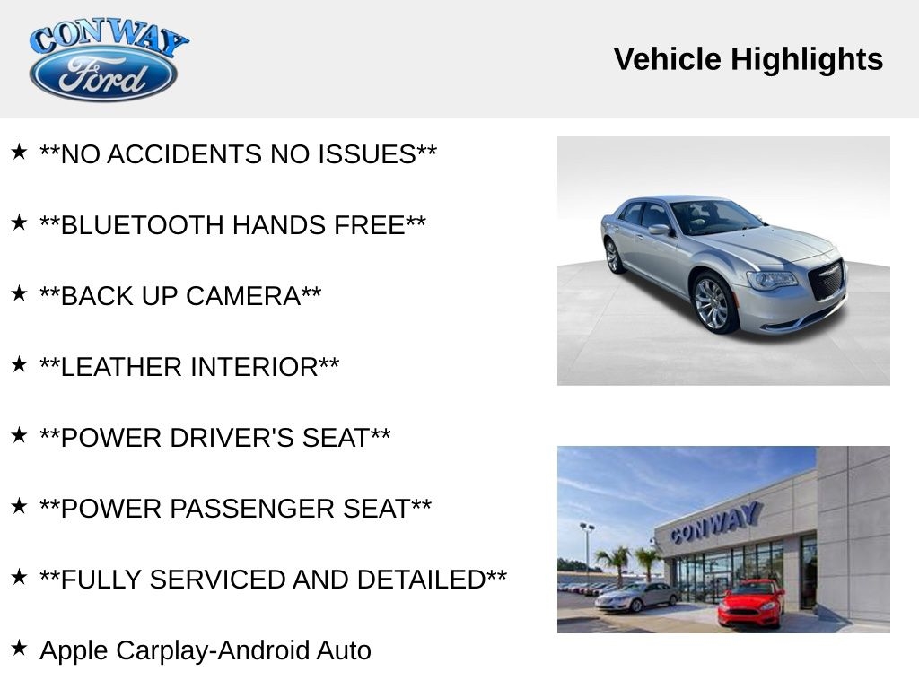 **NO ACCIDENTS NO ISSUES**, **BLUETOOTH HANDS FREE**, **BACK UP CAMERA**, **LEATHER INTERIOR**, **POWER DRIVER'S SEAT**, **POWER PASSENGER SEAT**, **FULLY SERVICED AND DETAILED**, Apple Carplay-Android Auto, Heated Front Seats, Satellite Radio, Dual Zone Climate Control, 300 Touring, 4D Sedan, 3.6L V6 24V VVT, Silver Mist Clearcoat, Black Leather, 4 Wheel Independent Suspension Comfort, 4-Wheel Disc Brakes, ABS brakes, Air Conditioning, AM/FM radio: SiriusXM, Apple CarPlay/Android Auto, Automatic temperature control, Brake assist, Bumpers: body-color, Compass, Cruise Control, Delay-off headlights, Driver door bin, Driver vanity mirror, Dual front impact airbags, Dual front side impact airbags, Dual Zone Auto A/C, Electronic Stability Control, Four wheel independent suspension, Front reading lights, Fully automatic headlights, Heated door mirrors, Heated Front Seats, Knee airbag, Leather Trimmed Bucket Seats, Low tire pressure warning, Outside temperature display, Panic alarm, ParkView Rear Back-Up Camera, Passenger door bin, Passenger vanity mirror, Power door mirrors, Power driver seat, Power Driver/Passenger 4-Way Lumbar Adjust, Power Front Driver/Passenger Seats, Power windows, Quick Order Package 2EF, Radio data system, Radio: Uconnect 4C w/8.4" Display, Rear window defroster, Security Alarm, Steering wheel mounted audio controls, Tachometer, Telescoping steering wheel, Traction control, Trip computer, Variably intermittent wipers, Wheels: 20" x 8.0" Polished Aluminum (DISC).