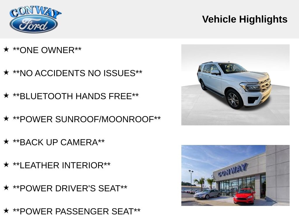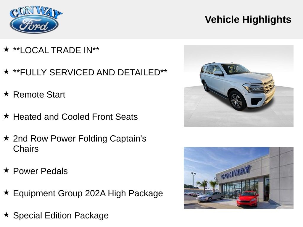 **ONE OWNER**, **NO ACCIDENTS NO ISSUES**, **BLUETOOTH HANDS FREE**, **POWER SUNROOF/MOONROOF**, **BACK UP CAMERA**, **LEATHER INTERIOR**, **POWER DRIVER'S SEAT**, **POWER PASSENGER SEAT**, **LOCAL TRADE IN**, **FULLY SERVICED AND DETAILED**, Remote Start, Heated and Cooled Front Seats, 2nd Row Power Folding Captain's Chairs, Power Pedals, Expedition XLT, 4D Sport Utility, EcoBoost 3.5L V6 GTDi DOHC 24V Twin Turbocharged, RWD, Oxford White, Black Onyx Cloth, 110V/150W AC Power Outlet, 2nd Row Power-Folding Captain's Chairs, 3.73 Axle Ratio, 3rd Row Vinyl Head Restraints, 4-Door Intelligent Access (Lock/Unlock), 4-Wheel Disc Brakes, ABS brakes, Accent Color Painted Rear Bumper, ActiveX-Trimmed 1st & 2nd Row Seats, Advanced Security Pack, Air Conditioning, AM/FM radio: SiriusXM with 360L, Ambient Lighting, Auto High-beam Headlights, Automatic temperature control, Brake assist, Bright Chrome Plated Accent Platform Running Boards, Bumpers: body-color, Compass, Cruise Control, Delay-off headlights, Driver door bin, Driver vanity mirror, Dual front impact airbags, Dual front side impact airbags, Dual Zone Auto A/C, Electronic Stability Control, Equipment Group 202A High Package, Exterior Parking Camera Rear, Four wheel independent suspension, Front Parking Sensors, Front reading lights, Fully automatic headlights, Garage door transmitter, Heated door mirrors, Heated Steering Wheel, Heated/Ventilated Front Seats, Heavy-Duty Trailer Tow Package, Integrated Trailer Brake Controller, Intersection Assist, LED Fog Lamps w/Accent Color Painted Bezel, LED Reflector Headlamps, Low tire pressure warning, Outside temperature display, Panic alarm, Panoramic Vista Roof, Passenger door bin, Passenger vanity mirror, Power door mirrors, Power driver seat, Power Liftgate, Power Tilt/Telescopic Steering Wheel w/Memory, Power windows, Power-Adjustable Pedals w/Memory, Power-Folding Sideview Mirrors w/Autofold, Pro Trailer Backup Assist, Radio data system, Rear air conditioning, Rear View Digital Camera, Rear window defroster, Rear window wiper, Reclining 3rd row seat, Remote keyless entry, Remote Start, Reverse Brake Assist, SecuriCode Keyless Entry Pad, Sideview Mirrors w/Turn Signal Indicators, SiriusXM w/360L, Special Edition Package, Spoiler, Steering wheel mounted audio controls, SYNC 4 w/Enhanced Voice Recognition, Tachometer, Telescoping steering wheel, Traction control, Trip computer, Variably intermittent wipers, Vinyl Center Console, Wireless Charging Pad.
