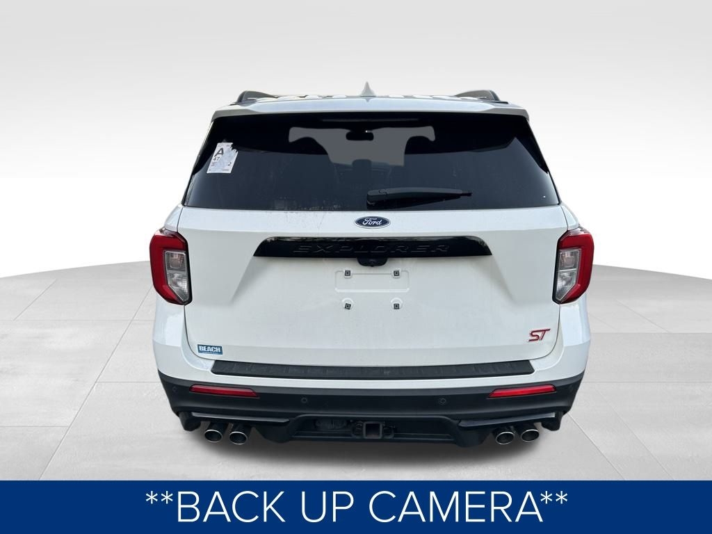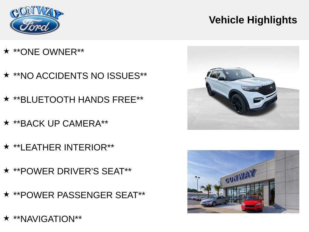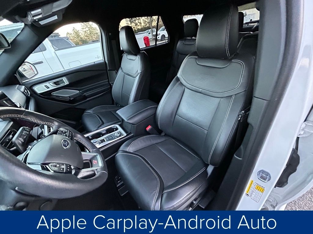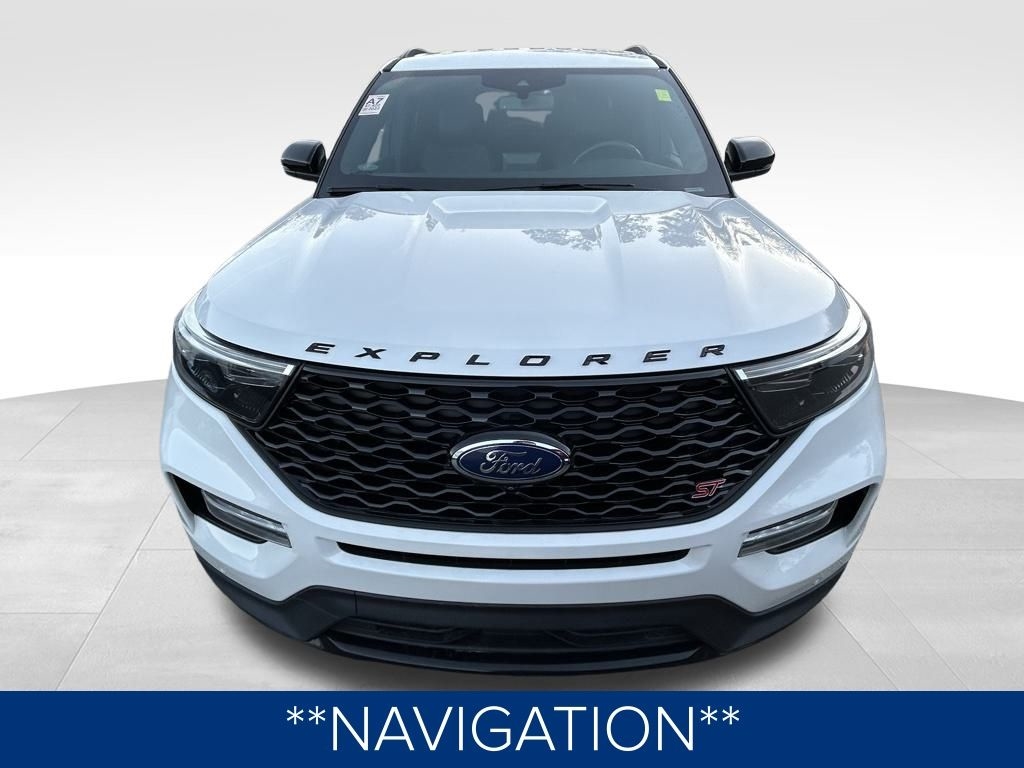 **ONE OWNER**, **NO ACCIDENTS NO ISSUES**, **BLUETOOTH HANDS FREE**, **BACK UP CAMERA**, **LEATHER INTERIOR**, **POWER DRIVER'S SEAT**, **POWER PASSENGER SEAT**, **NAVIGATION**, **BALANCE OF FACTORY WARRANTY**, **FULLY SERVICED AND DETAILED**, Apple Carplay-Android Auto, Remote Start, Ford CoPilot360 Assist+, Premium Technology Package, FordPass Connect, Rain Sense Wipers, ST High Package, MultiContour Front Seats, Explorer ST, 4D Sport Utility, 3.0L EcoBoost V6, 4WD, Star White Metallic Tri-Coat, Ebony Leather, 10.1" LCD Capacitive Portrait Touchscreen, 110V/150W AC Power Outlet, 1st Row Heated Seats, 2 Additional Speakers, 360-Degree Camera w/Split View, 3rd row seats: bench, 4-Wheel Disc Brakes, ABS brakes, Air Conditioning, AM/FM radio: SiriusXM, Auto High-beam Headlights, Auto-Dimming Rearview Mirror (Interior), Automatic temperature control, Brake assist, Bumpers: body-color, Compass, Delay-off headlights, Driver door bin, Driver vanity mirror, Dual front impact airbags, Dual front side impact airbags, Dual Zone Auto A/C, Electronic Stability Control, Equipment Group 401A, Evasive Steering Assist, Exterior Parking Camera Rear, Ford Co-Pilot360 Assist+, FordPass Connect, Four wheel independent suspension, Front Bucket Seats, Front Parking Sensors, Front Rain-Sensing Wipers, Front reading lights, Fully automatic headlights, Hands-Free Foot-Activated Liftgate, Heated door mirrors, Heated Seats, Heated steering wheel, Illuminated entry, Intelligent Adaptive Cruise Control, Knee airbag, Leather Htd/Ventilated Sport Captain's Chairs, Leather steering wheel, Low tire pressure warning, Memory Driver's Seat, Memory seat, Navigation System, Outside temperature display, Panic alarm, Passenger door bin, Passenger vanity mirror, Performance Front & Rear Brakes, Power door mirrors, Power driver seat, Power Liftgate, Power passenger seat, Power Tilt/Telescoping Steering Column, Power windows, Premium Technology Package, Radio: B&O Sound System by Bang & Olufsen, Rear air conditioning, Rear reading lights, Rear window defroster, Rear window wiper, Remote keyless entry, Reverse Brake Assist, Second Row Heated Seats, SelectShift Capability w/Paddle Shifters, Sideview Mirrors w/Gloss Black Caps, Speed Sign Recognition, Spoiler, Sport steering wheel, ST High Package, ST Street Pack, Steering wheel mounted audio controls, SYNC 3 Communications & Entertainment System, SYNC 3/Apple CarPlay/Android Auto, Tachometer, Telescoping steering wheel, Third Row PowerFold (Folds Flat), Traction control, Trip computer, Universal Garage Door Opener (UGDO), Variably intermittent wipers, Voice-Activated Touchscreen Navigation System, Wheels: 21" Aluminum, Wireless Charging Pad.