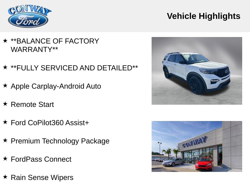 Equipped with a potent 3.0L EcoBoost V6 engine and a smooth 10-speed automatic transmission, this Explorer ST delivers an exhilarating driving experience. The advanced 4WD system ensures confident handling in any conditions, while the premium technology package and Ford Co-Pilot360 Assist+ features provide a truly exceptional driving experience.