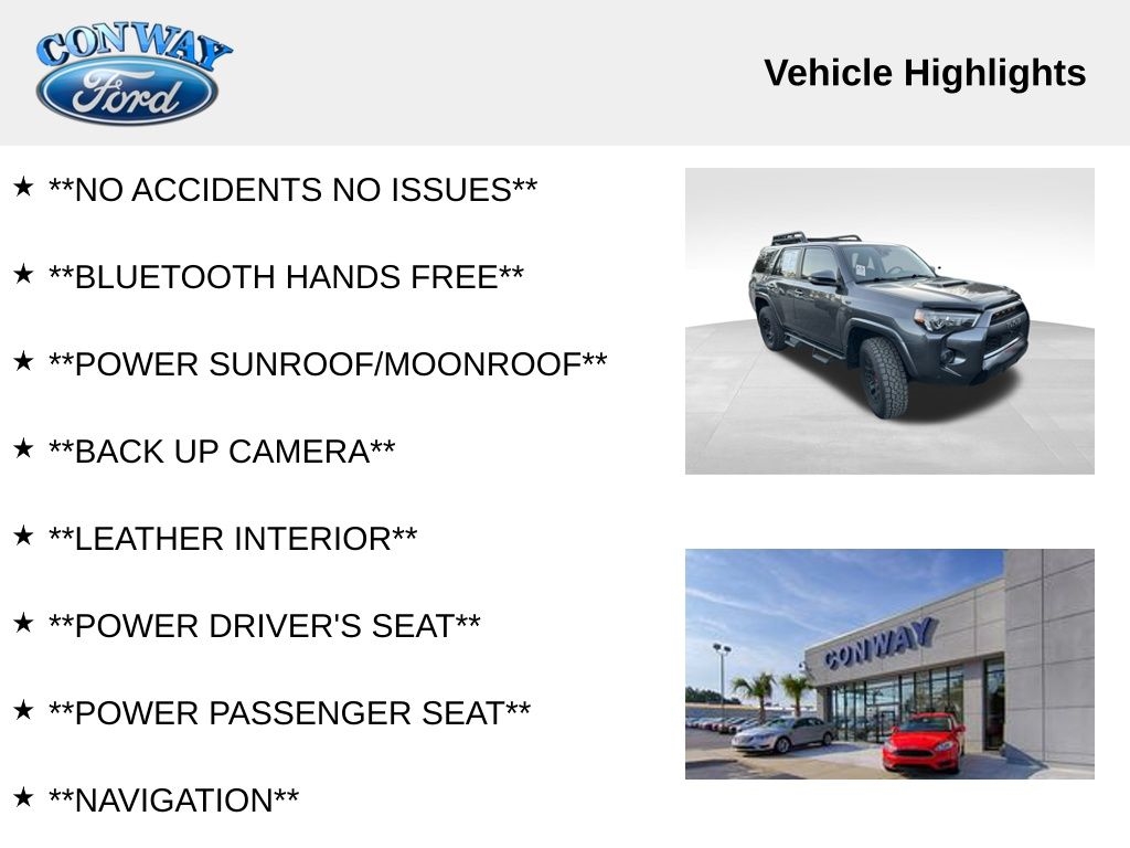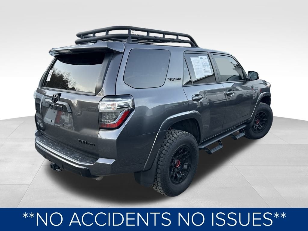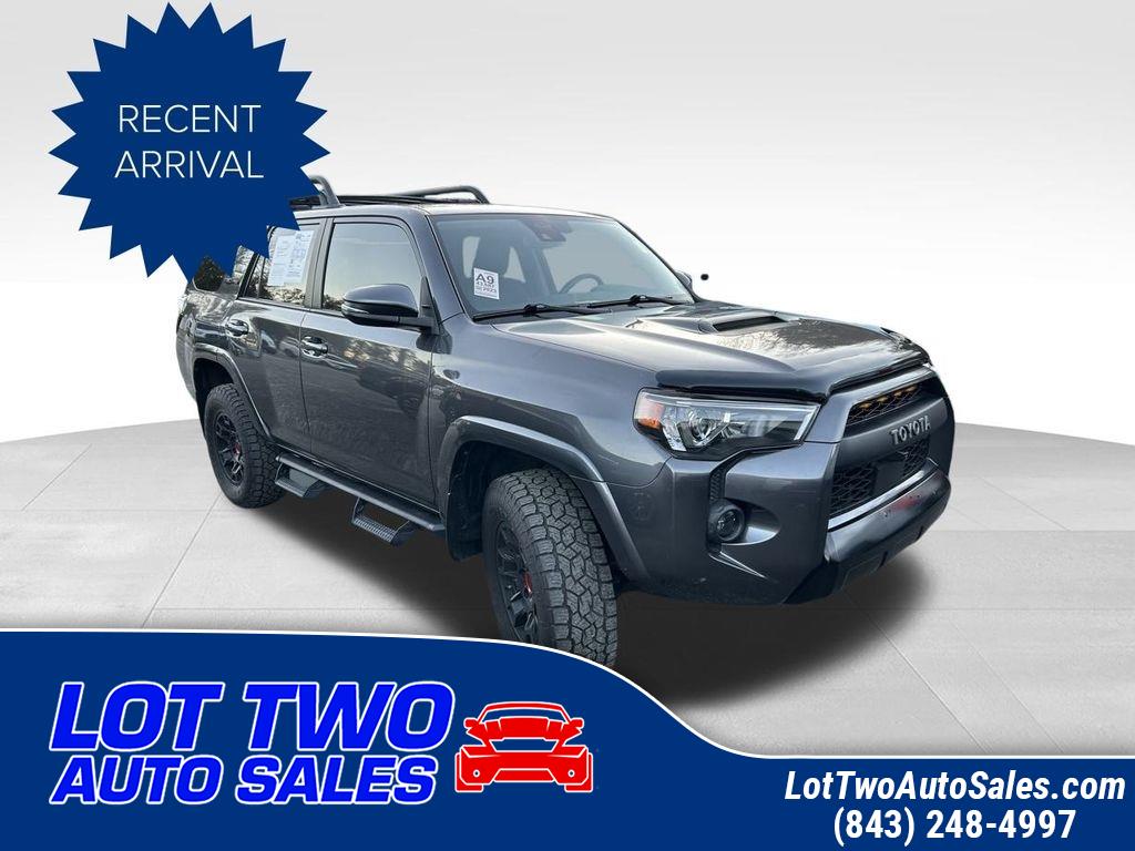 **NO ACCIDENTS NO ISSUES**, **BLUETOOTH HANDS FREE**, **POWER SUNROOF/MOONROOF**, **BACK UP CAMERA**, **LEATHER INTERIOR**, **POWER DRIVER'S SEAT**, **POWER PASSENGER SEAT**, **NAVIGATION**, **BALANCE OF FACTORY WARRANTY**, **FULLY SERVICED AND DETAILED**, Apple Carplay-Android Auto, Predator Bars, JBL 15 Speaker System, Dynamic Radar Cruise Control, TRD-Tuned Fox Shocks and Springs TRD Stamped Aluminum Front Skid Plate, 4Runner TRD Pro, 4D Sport Utility, 4.0L V6 DOHC 24V, 4WD, 15 Speakers, 4-Wheel Disc Brakes, ABS brakes, Adaptive Cruise Control, AM/FM radio: SiriusXM, Apple CarPlay/Android Auto, Auto High-beam Headlights, Auto-dimming Rear-View mirror, Brake assist, Bumpers: body-color, Compass, Driver door bin, Driver vanity mirror, Dual front impact airbags, Dual front side impact airbags, Dual Power Ports/Quick Charge Cable Pkg (PPO) (TMS), Dual Zone Auto Climate Control, Electronic Stability Control, Exterior Parking Camera Rear, Fog Lights, Fox Shocks, Front fog lights, Front reading lights, Front wheel independent suspension, Garage Door Opener, Garage door transmitter: HomeLink, Heated door mirrors, Heated Front and Rear Seats Bucket Seats, Heated Outside Rear-View Mirrors, Knee airbag, Leather Shift Knob, Low tire pressure warning, Moonroof w/Tilt Up & Slide, Multi-Terrain Back Monitor, Navigation System, Outside temperature display, Panic alarm, Passenger door bin, Power door mirrors, Power driver seat, Power passenger seat, Power windows, Radio: Premium Audio w/JBL, Rear window wiper, Remote keyless entry, Roof rack, Roof Rack, SofTex Seat Trim, Spoiler, Steering wheel mounted audio controls, Tachometer, Telescoping steering wheel, Traction control, TRD Pro All Weather Floor Liner, TRD Pro Badging, TRD Pro Exhaust, TRD Pro Package, TRD Shift Knob, Variably intermittent wipers, Wheels: 17" Matte Black Flow-Formed TRD Alloy.