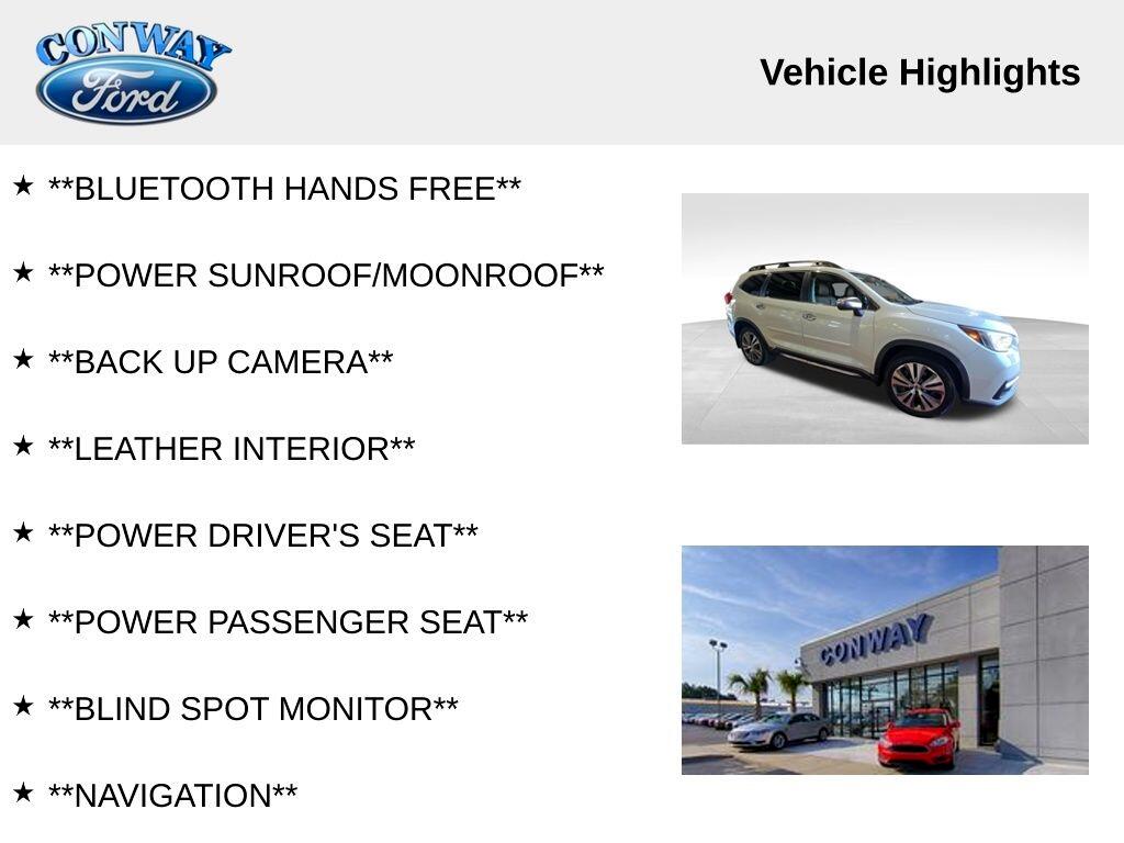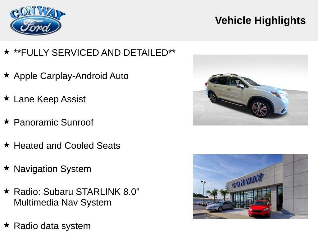 **BLUETOOTH HANDS FREE**, **POWER SUNROOF/MOONROOF**, **BACK UP CAMERA**, **LEATHER INTERIOR**, **POWER DRIVER'S SEAT**, **POWER PASSENGER SEAT**, **BLIND SPOT MONITOR**, **NAVIGATION**, **FULLY SERVICED AND DETAILED**, Apple Carplay-Android Auto, Lane Keep Assist, Panoramic Sunroof, Heated and Cooled Seats, Ascent Touring, 4D Sport Utility, AWD, Crystal White Pearl, Java Leather, 3rd row seats: bench, 4-Wheel Disc Brakes, ABS brakes, Air Conditioning, AM/FM radio: SiriusXM, Auto High-beam Headlights, Automatic temperature control, Brake assist, Bumpers: body-color, Compass, Cruise Control, Delay-off headlights, Driver door bin, Driver vanity mirror, Dual front impact airbags, Dual front side impact airbags, Dual Zone Auto A/C, Electronic Stability Control, Exterior Parking Camera Rear, Four wheel independent suspension, Front fog lights, Front reading lights, Fully automatic headlights, Garage door transmitter: HomeLink, harman/kardon® Speakers, Heated & Ventilated Front Bucket Seats, Heated door mirrors, Heated steering wheel, Knee airbag, Low tire pressure warning, Memory seat, Navigation System, Outside temperature display, Panic alarm, Passenger door bin, Passenger vanity mirror, Perforated Leather-Trimmed Upholstery, Power door mirrors, Power driver seat, Power Liftgate, Power moonroof, Power passenger seat, Power windows, Radio data system, Radio: Subaru STARLINK 8.0" Multimedia Nav System, Rain sensing wipers, Rear air conditioning, Rear window defroster, Rear window wiper, Remote keyless entry, Spoiler, STARLINK/Apple CarPlay/Android Auto, Steering wheel mounted audio controls, Tachometer, Telescoping steering wheel, Traction control, Trip computer, Variably intermittent wipers, Wheels: 20" Dk Gray Aluminum Alloy w/Machine Finish.