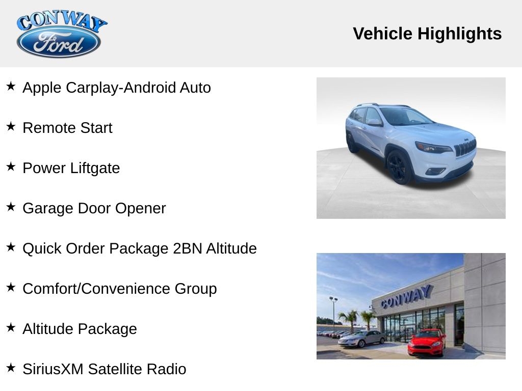 **ONE OWNER**, **NO ACCIDENTS NO ISSUES**, **BLUETOOTH HANDS FREE**, **BACK UP CAMERA**, **POWER DRIVER'S SEAT**, **BLIND SPOT MONITOR**, **LOCAL TRADE IN**, **FULLY SERVICED AND DETAILED**, Apple Carplay-Android Auto, Remote Start, Power Liftgate, Garage Door Opener, Cherokee Altitude, 4D Sport Utility, 2.4L I4, FWD, Bright White Clearcoat, 115V Auxiliary Power Outlet, 4-Wheel Disc Brakes, ABS brakes, Air Conditioning, Air Conditioning ATC w/Dual Zone Control, Altitude Package, Apple CarPlay/Android Auto, Auto-Dimming Rear-View Mirror, Black Day Light Opening Moldings, Brake assist, Bumpers: body-color, Comfort/Convenience Group, Cruise Control, Delay-off headlights, Driver door bin, Driver vanity mirror, Dual front impact airbags, Dual front side impact airbags, Electronic Stability Control, Four wheel independent suspension, Front Bucket Seats, Front fog lights, Front reading lights, Fully automatic headlights, Gloss Black Exterior Accents, Gloss Black Exterior Badging, Gloss Black Grille Surrounds, Gloss Black Side Roof Rails, Heated door mirrors, Humidity Sensor, Knee airbag, Low tire pressure warning, Panic alarm, Passenger door bin, Piano Black Interior Accents, Power door mirrors, Power driver seat, Power Liftgate, Power windows, Premium Air Filter, Quick Order Package 2BN Altitude, Radio data system, Radio: Uconnect 4 w/7" Display, Rear window defroster, Rear window wiper, Remote keyless entry, Security Alarm, SiriusXM Satellite Radio, Spoiler, Steering wheel mounted audio controls, Tachometer, Telescoping steering wheel, Traction control, Universal Garage Door Opener, Variably intermittent wipers, Wheels: 17" x 7" Satin Carbon Aluminum, Wheels: 18" x 7" Gloss Black 5-Spoke Aluminum.