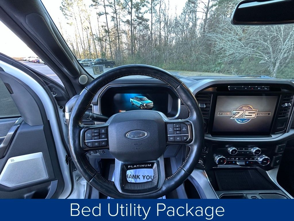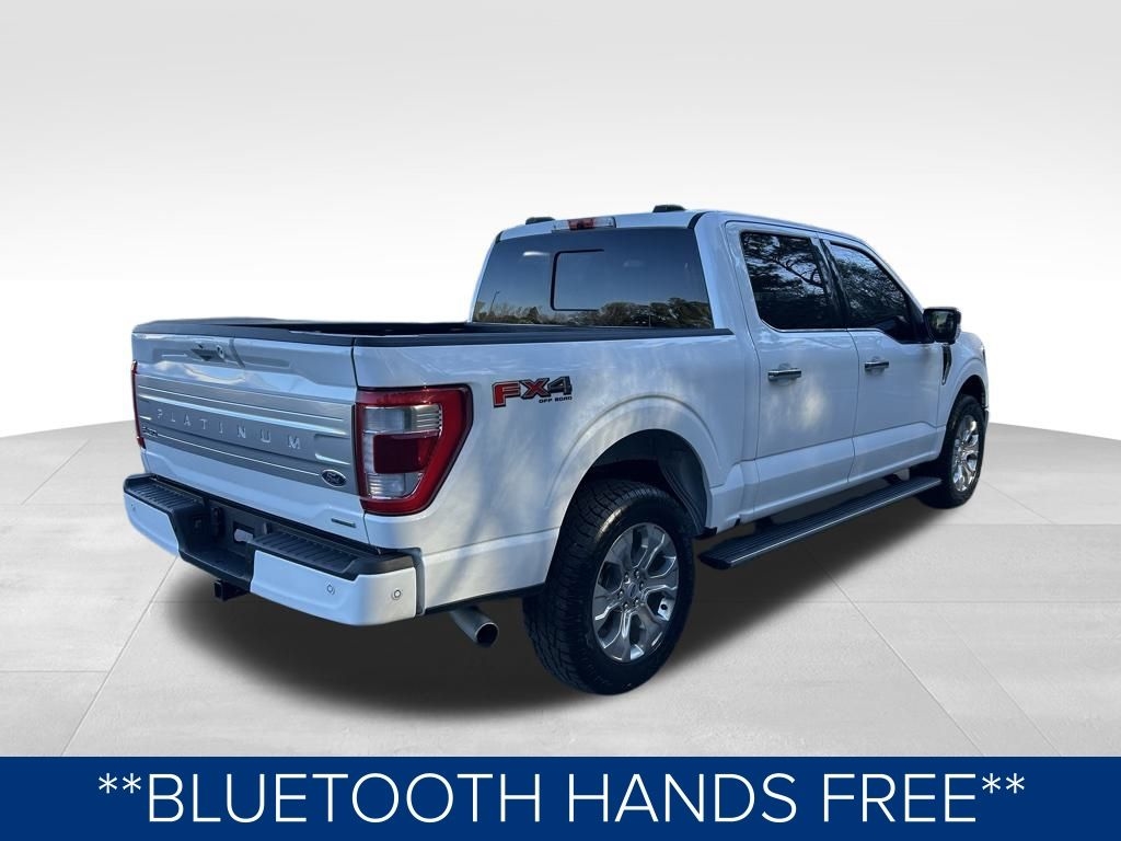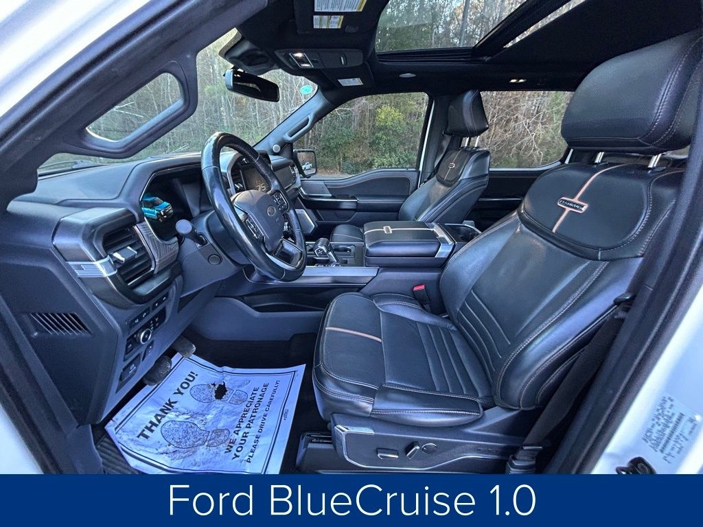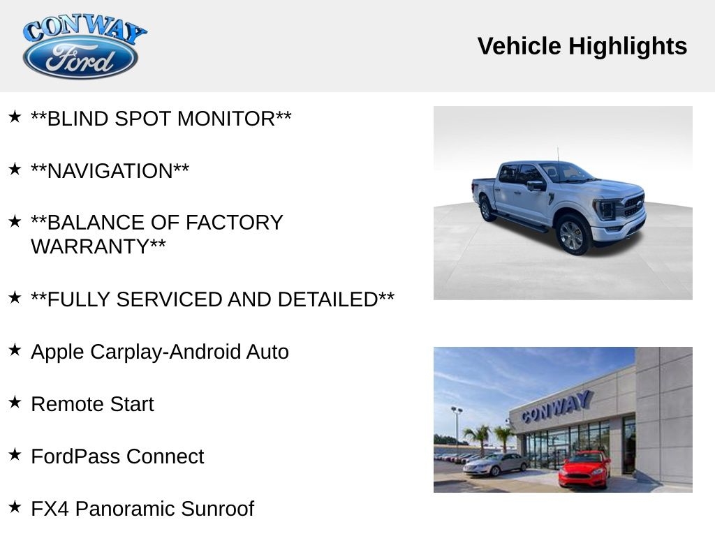 **ONE OWNER**, **NO ACCIDENTS NO ISSUES**, **BLUETOOTH HANDS FREE**, **POWER SUNROOF/MOONROOF**, **BACK UP CAMERA**, **LEATHER INTERIOR**, **POWER DRIVER'S SEAT**, **POWER PASSENGER SEAT**, **BLIND SPOT MONITOR**, **NAVIGATION**, **BALANCE OF FACTORY WARRANTY**, **FULLY SERVICED AND DETAILED**, Apple Carplay-Android Auto, Remote Start, FordPass Connect, FX4 Panoramic Sunroof, Pro Power Onboard-2kw, Max Trailer Pcakge, Ford CoPilot360 Active 2.0, Power Tailgate, 360 Degree Camera Package, 18 Speaker B&O Sound System Unleashed, F-150 Platinum, 4D SuperCrew, 3.5L V6 EcoBoost, 4WD, Star White Metallic Tri-Coat, Black Leather, 20" Polished Aluminum Wheels, 360 Degree Camera, 4-Wheel Disc Brakes, 4x4 FX4 Off-Road Bodyside Decal, ABS brakes, Active Park Assist 2.0 Removal, Adaptive Cruise Control, Adjustable pedals, Air Conditioning, AM/FM radio: SiriusXM with 360L, Auto High-beam Headlights, Automatic temperature control, Bed Utility Package, BoxLink, Brake assist, Bumpers: body-color, Class IV Trailer Hitch Receiver, Compass, Delay-off headlights, Driver door bin, Driver vanity mirror, Dual front impact airbags, Dual front side impact airbags, Dual Zone Auto A/C, Electronic Locking w/3.31 Axle Ratio, Electronic Stability Control, Equipment Group 701A High, Extended Range 36 Gallon Fuel Tank, Exterior Parking Camera Rear, Ford BlueCruise 1.0, Front fog lights, Front reading lights, Front wheel independent suspension, Fully automatic headlights, FX4 Off-Road Package, Garage door transmitter, GVWR: 7,050 lbs Payload Package, Heated door mirrors, Heated Seats, Heated steering wheel, Hill Descent Control, Integrated Trailer Brake Controller, LED Box Lighting, Low tire pressure warning, Max Trailer Tow Package, Memory seat, Monotube Rear Shocks, Navigation System, Off-Road Tuned Front Shock Absorbers, Outside temperature display, Panic alarm, Passenger door bin, Passenger vanity mirror, Pedal memory, Power door mirrors, Power driver seat, Power passenger seat, Power Tailgate, Power windows, Pro Power Onboard - 2KW, Pro Trailer Backup Assist & Pro Trailer Hitch Assist, Radio data system, Radio: B&O Unleashed Sound System by Bang & Olufsen, Rain sensing wipers, Rear step bumper, Rear window defroster, Remote keyless entry, Rock Crawl Mode, Steering wheel memory, Steering wheel mounted audio controls, SYNC 4 w/Enhanced Voice Recognition, Tachometer, Tailgate Step w/Tailgate Work Surface, Telescoping steering wheel, Traction control, Tray Style Floor Liner, Trip computer, Turn signal indicator mirrors, Twin Panel Moonroof, Variably intermittent wipers, Ventilated front seats.