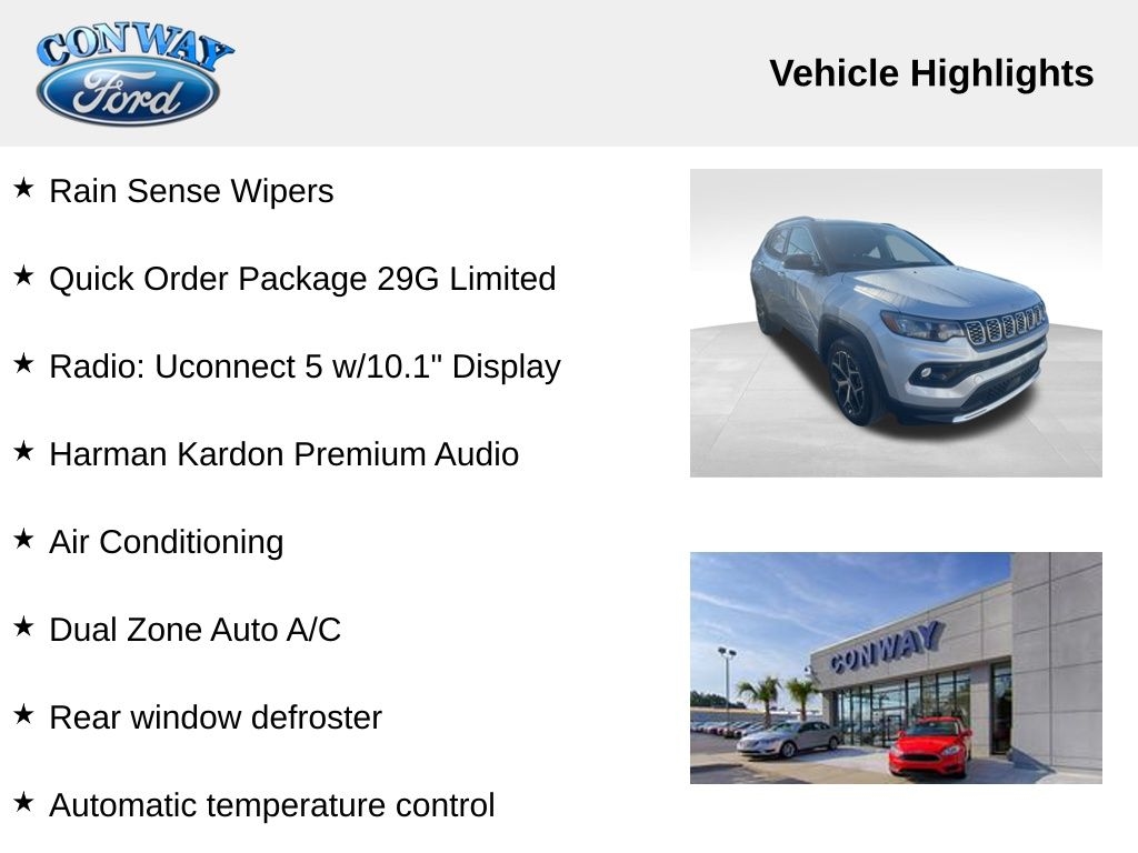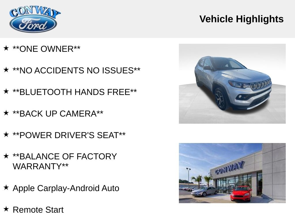**ONE OWNER**, **NO ACCIDENTS NO ISSUES**, **BLUETOOTH HANDS FREE**, **BACK UP CAMERA**, **POWER DRIVER'S SEAT**, **BALANCE OF FACTORY WARRANTY**, Apple Carplay-Android Auto, Remote Start, Rain Sense Wipers, Compass Limited, 4D Sport Utility, 2.0L I4 DOHC, 4WD, Silver Zynith Metallic Clearcoat, Black Artificial Leather, 10.1" Touchscreen Display, 4-Wheel Disc Brakes, ABS brakes, Air Conditioning, Apple CarPlay/Android Auto, Auto High-beam Headlights, Automatic temperature control, Brake assist, Bumpers: body-color, Compass, Cruise Control, Delay-off headlights, Driver door bin, Driver vanity mirror, Dual front impact airbags, Dual front side impact airbags, Dual Zone Auto A/C, Electronic Stability Control, Four wheel independent suspension, Front fog lights, Fully automatic headlights, Harman Kardon Premium Audio, Heated door mirrors, Heated Seats, Heated steering wheel, Knee airbag, Leather Shift Knob, Leather steering wheel, Leatherette Seats, Low tire pressure warning, Panic alarm, ParkView Rear Back-Up Camera, Passenger door bin, Power 2-Way Passenger Lumbar Adjust, Power 8-Way Adjust Front Passenger Seat, Power door mirrors, Power driver seat, Power windows, Quick Order Package 29G Limited, Radio: Uconnect 5 w/10.1" Display, Rain sensing wipers, Rear window defroster, Rear window wiper, Remote keyless entry, Spoiler, Steering wheel mounted audio controls, Tachometer, Telescoping steering wheel, Traction control, Variably intermittent wipers, Wheels: 18" x 7" Painted Diamond Cut Aluminum. Priced below KBB Fair Purchase Price!