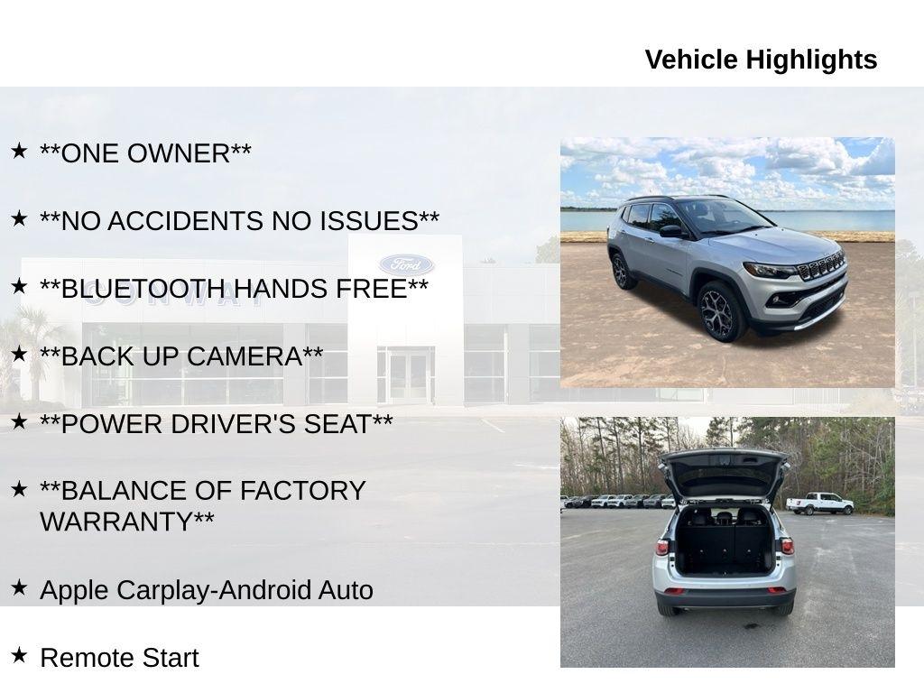 **ONE OWNER**, **NO ACCIDENTS NO ISSUES**, **BLUETOOTH HANDS FREE**, **BACK UP CAMERA**, **POWER DRIVER'S SEAT**, **BALANCE OF FACTORY WARRANTY**, Apple Carplay-Android Auto, Remote Start, Rain Sense Wipers, Compass Limited **Low Miles**, 4D Sport Utility, 2.0L I4 DOHC, 4WD, Silver Zynith Metallic Clearcoat, Black Artificial Leather, 10.1" Touchscreen Display, 4-Wheel Disc Brakes, ABS brakes, Air Conditioning, Apple CarPlay/Android Auto, Auto High-beam Headlights, Automatic temperature control, Brake assist, Bumpers: body-color, Compass, Cruise Control, Delay-off headlights, Driver door bin, Driver vanity mirror, Dual front impact airbags, Dual front side impact airbags, Dual-Zone Climate, Electronic Stability Control, Four wheel independent suspension, Front fog lights, Fully automatic headlights, Harman Kardon Premium Audio, Heated door mirrors, Heated Seats, Heated steering wheel, Knee airbag, Leather Shift Knob, Leather steering wheel, Leatherette Seats, Low tire pressure warning, Panic alarm, ParkView Rear Back-Up Camera, Passenger door bin, Power 2-Way Passenger Lumbar Adjust, Power 8-Way Adjust Front Passenger Seat, Power door mirrors, Power driver seat, Power windows, Quick Order Package 29G Limited, Radio: Uconnect 5 w/10.1" Display, Rain sensing wipers, Rear window defroster, Rear window wiper, Remote keyless entry, Spoiler, Steering wheel mounted audio controls, Tachometer, Telescoping steering wheel, Traction control, Variably intermittent wipers, Wheels: 18" x 7" Painted Diamond Cut Aluminum. Priced below KBB Fair Purchase Price!