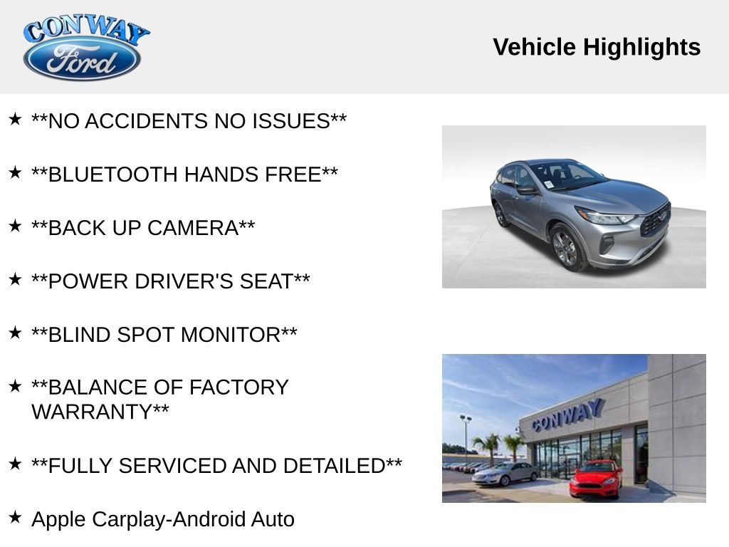 **NO ACCIDENTS NO ISSUES**, **BLUETOOTH HANDS FREE**, **BACK UP CAMERA**, **POWER DRIVER'S SEAT**, **BLIND SPOT MONITOR**, **BALANCE OF FACTORY WARRANTY**, **FULLY SERVICED AND DETAILED**, Apple Carplay-Android Auto, Remote Start, Adaptive Cruise and Evasive Steering, FordPass Connect, Cold Weather Package, Escape ST-Line, 4D Sport Utility, 1.5L EcoBoost, AWD, Iconic Silver Metallic, Ebony With Red Stitching Cloth/Vinyl, 4-Wheel Disc Brakes, ABS brakes, Adaptive Cruise Control, Air Conditioning, AM/FM radio: SiriusXM, Auto High-beam Headlights, Automatic temperature control, Brake assist, Bumpers: body-color, Compass, Connected Built-In Navigation, Delay-off headlights, Driver door bin, Driver vanity mirror, Dual front impact airbags, Dual front side impact airbags, Dual Zone Auto A/C, Electronic Stability Control, Equipment Group 300A, Ford Co-Pilot360 Assist+, Four wheel independent suspension, Front Bucket Seats, Front reading lights, Fully automatic headlights, Heated door mirrors, Heated Seats, Heated steering wheel, Intelligent Adaptive Cruise Control w/Stop-and-Go, Knee airbag, Low tire pressure warning, Navigation System, Outside temperature display, Panic alarm, Passenger door bin, Power door mirrors, Power driver seat, Power Liftgate, Power windows, Radio data system, Rear Parking Sensor, Rear window defroster, Rear window wiper, Rear-View Camera, Remote keyless entry, Speed Sign Recognition, Spoiler, Sport steering wheel, Steering wheel mounted audio controls, SYNC 4 w/Enhanced Voice Recognition, Tachometer, Tech Pack #1, Telescoping steering wheel, Trip computer, Variably intermittent wipers, Vinyl/Cloth Front Sport Contour Bucket Seats, Wheels: 18" Rock Metallic Painted Aluminum.