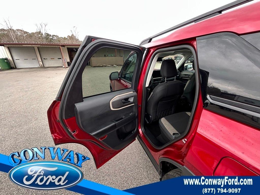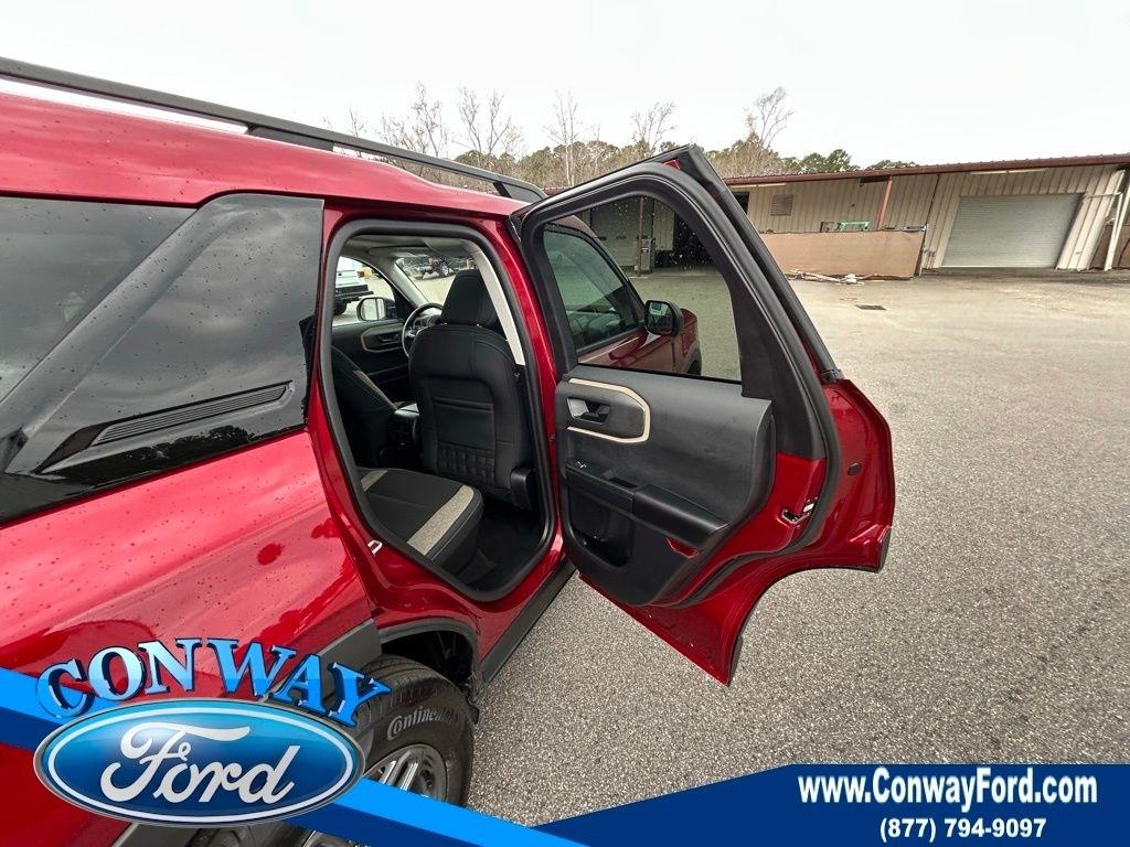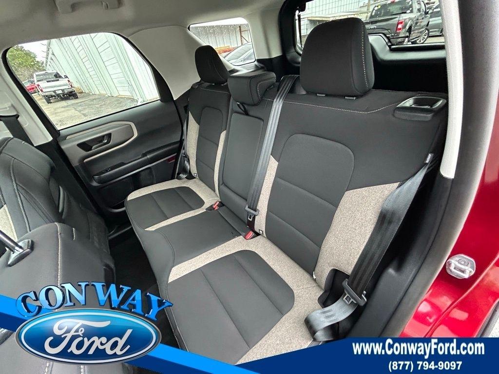 The Bronco Sport's rugged good looks and impressive capabilities are further enhanced by the Convenience Package, which includes a heated 8-way power driver's seat, universal garage door opener, premium wrapped steering wheel, and LED fog lamps. The stunning Ruby Red Metallic Tinted Clearcoat exterior completes the package, creating a vehicle that is both eye-catching and capable.