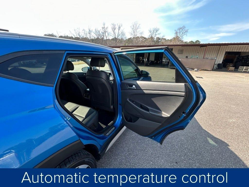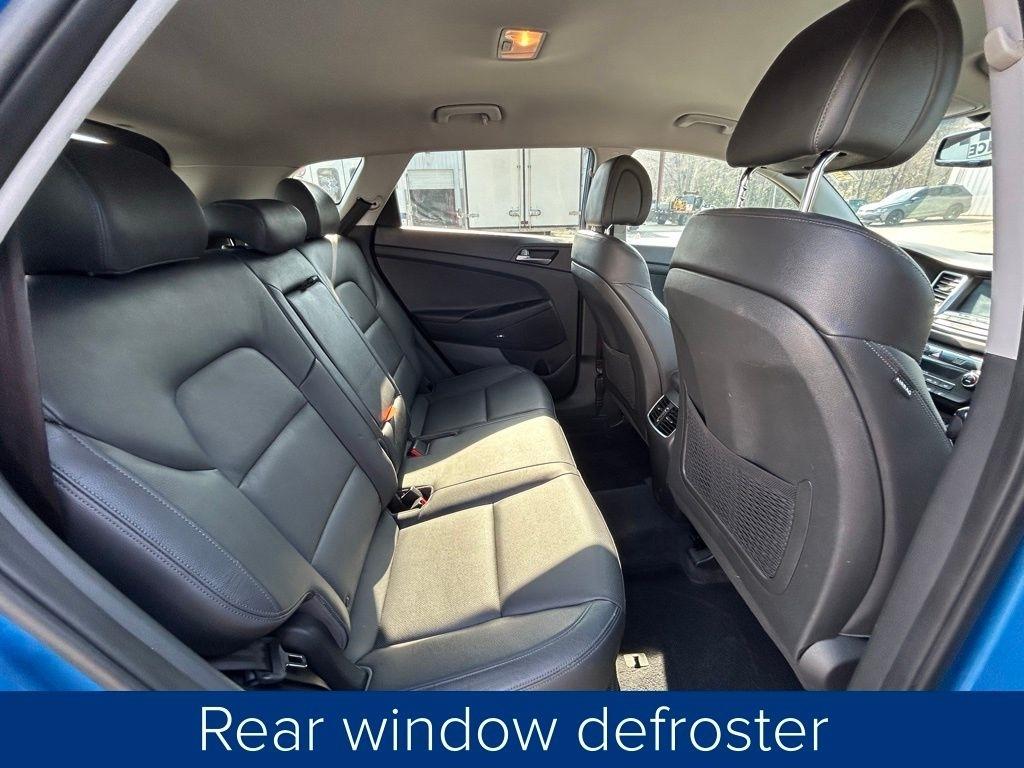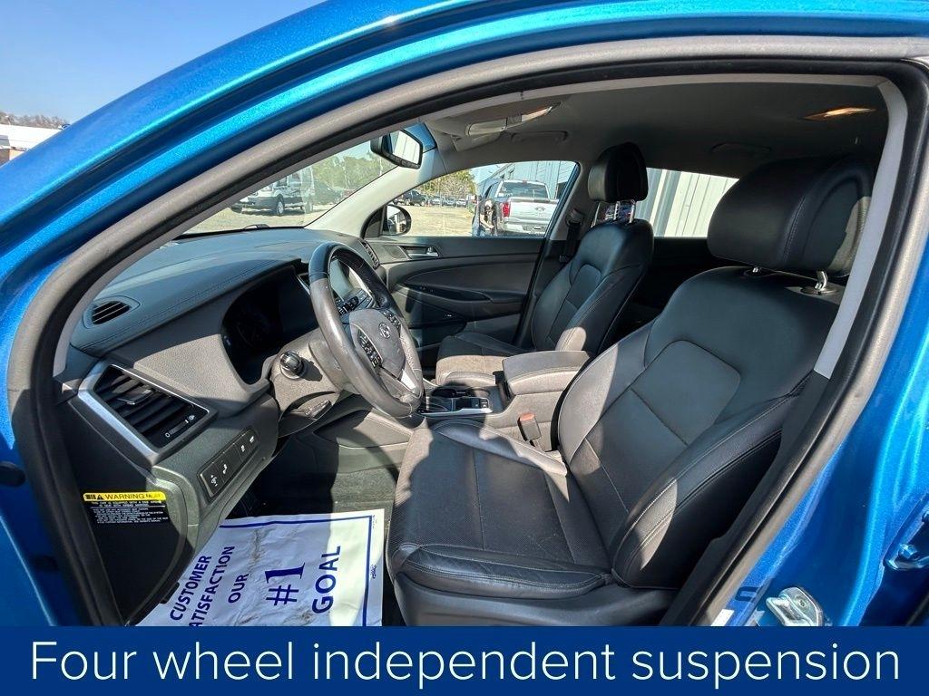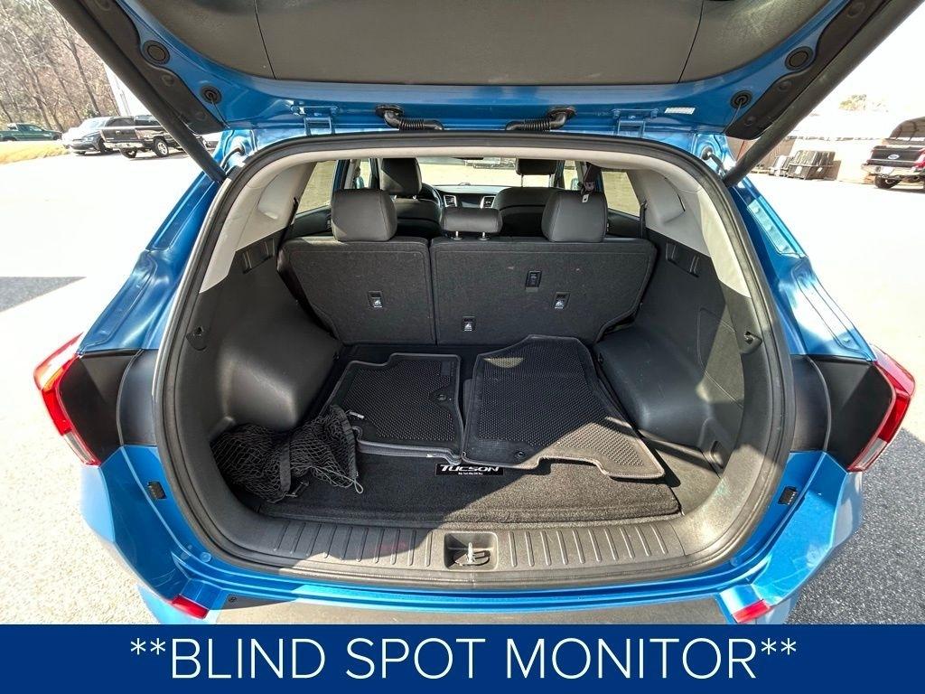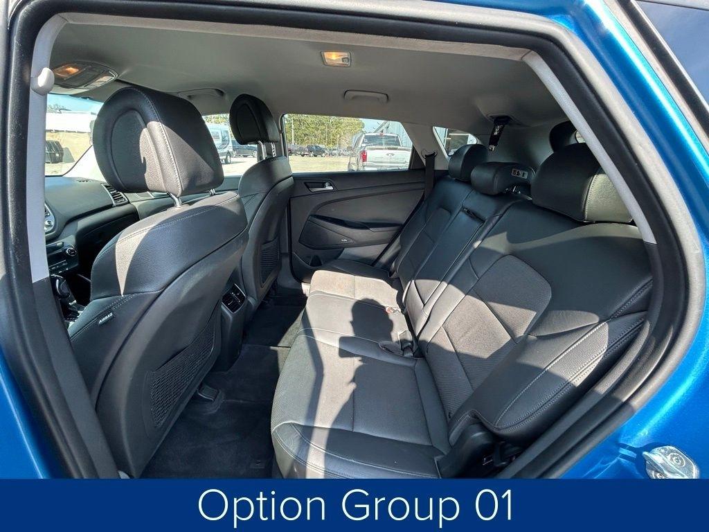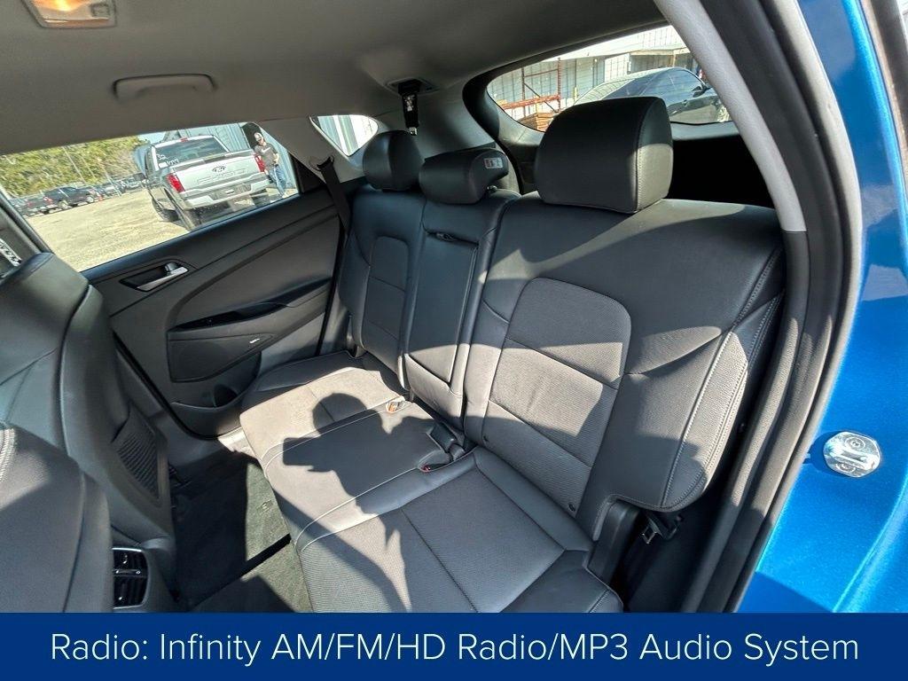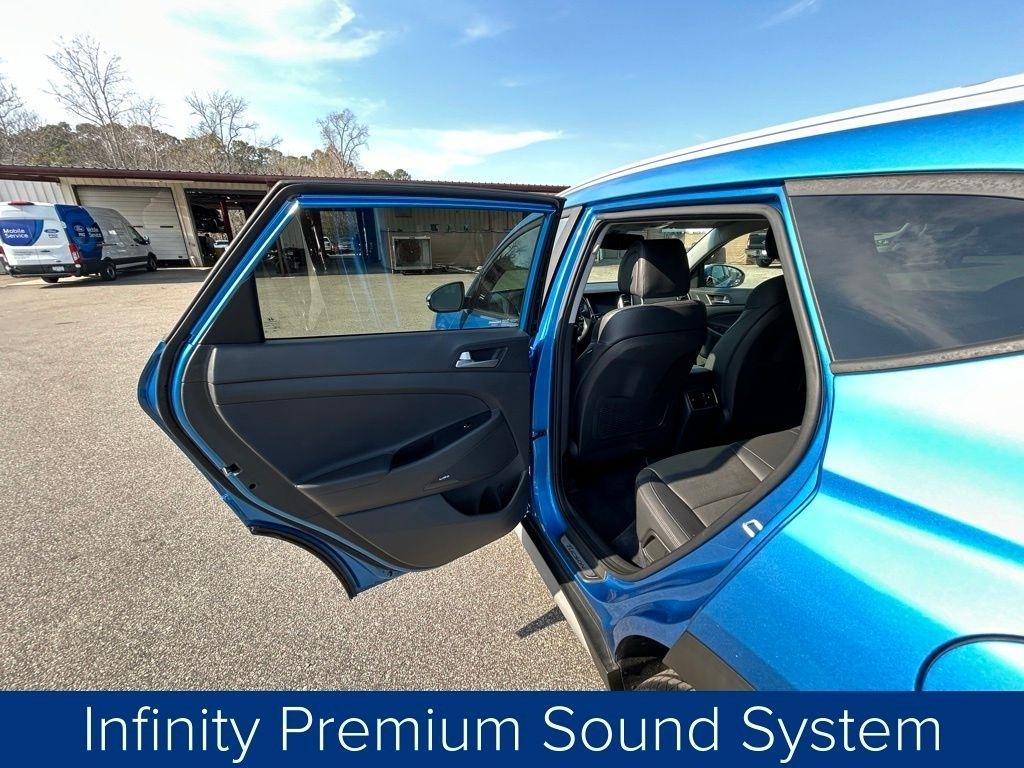 This Tucson also comes equipped with a premium Infinity sound system, a power liftgate, and heated front seats, providing both convenience and comfort. The sleek blue exterior and 19-inch alloy wheels give this vehicle a stylish and modern appearance.