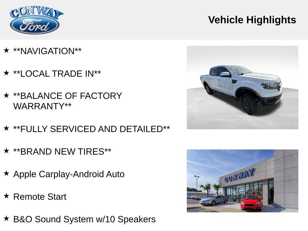 This 2022 Ford Ranger Lariat is packed with an impressive array of features that will elevate your driving experience. Let's take a closer look at what this exceptional vehicle has to offer: