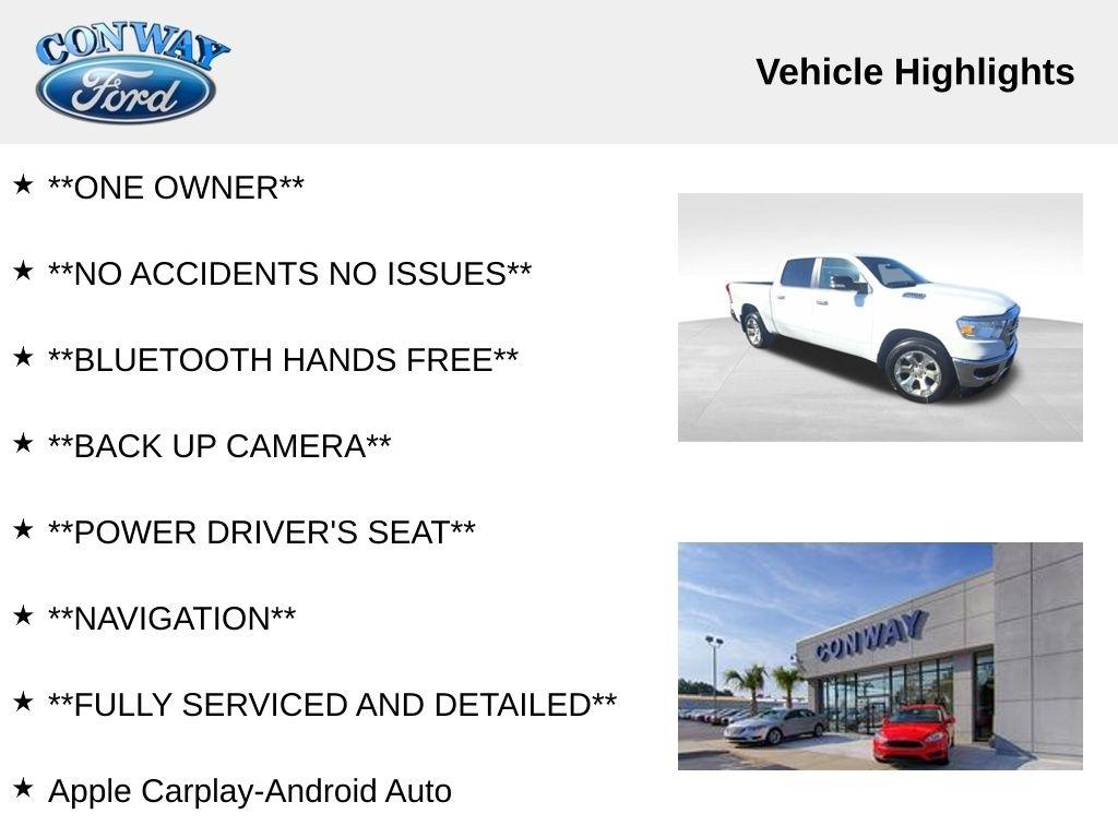 **ONE OWNER**, **NO ACCIDENTS NO ISSUES**, **BLUETOOTH HANDS FREE**, **BACK UP CAMERA**, **POWER DRIVER'S SEAT**, **NAVIGATION**, **FULLY SERVICED AND DETAILED**, Apple Carplay-Android Auto, Satellite XM Radio, Trailer Package, Power Adjustable Pedals, Driver Seat Power w/Power Lumbar Adjust, 1500 Big Horn/Lone Star, 4D Crew Cab, HEMI 5.7L V8 Multi Displacement VVT, Bright White Clearcoat.