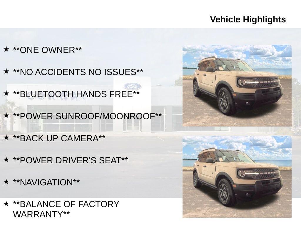 Whether you're seeking a capable off-road companion or a versatile daily driver, the 2025 Ford Bronco Sport Big Bend is the perfect choice. With the balance of the factory warranty and a meticulous service history, this one-owner vehicle is ready to embark on your next adventure. Visit our showroom today to experience the Bronco Sport Big Bend firsthand and discover the ultimate in rugged refinement.