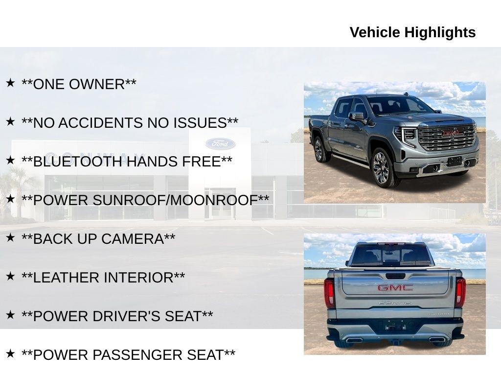 - AM/FM radio: SiriusXM with 360L - Premium Bose 7-Speaker Sound System - Radio data system - Radio: Premium GMC Infotainment Audio System - SiriusXM with 360L Trial Subscription - Steering Wheel Audio Controls - Air Conditioning - Automatic temperature control - Dual-Zone Climate - Electric Rear-Window Defogger - Rear window defroster - 120-Volt Bed Mounted Power Outlet - 120-Volt Interior Power Outlet - Memory seat - Power Front Passenger Windows with Express Up/Down - Power Front Windows with Driver Express Up/Down - Power Rear Windows with Express Down - Power windows - Push Button Start - Remote keyless entry - Remote Vehicle Starter System - Steering wheel mounted audio controls - Adaptive Cruise Control - Super Cruise - Brake assist - Electronic Stability Control - Universal Home Remote - Adaptive suspension - Auto-Locking Rear Differential - Power Rake and Telescoping Steering Column - Super Cruise Wrapped Steering Wheel - Traction control - Auto High-beam Headlights - Delay-off headlights - Front fog lights - Fully automatic headlights - Perimeter Lighting - 170 Amp Alternator - Auxiliary External Transmission Oil Cooler - Heavy-Duty Air Filter - Bumpers: body-color - Chrome Header with Signature Denali Chrome Grille - Chrome Wheel to Wheel Assist Steps - Denali Premium Suspension with Adaptive Ride Control - Dual Active Exhaust - GMC MultiPro Power Steps - Heated door mirrors - IntelliBeam Automatic High Beam on/Off - LED Cargo Area Lighting - Power door mirrors - Rear step bumper - Rear Wheelhouse Liners - Spray-on Pickup Bedliner with GMC Logo