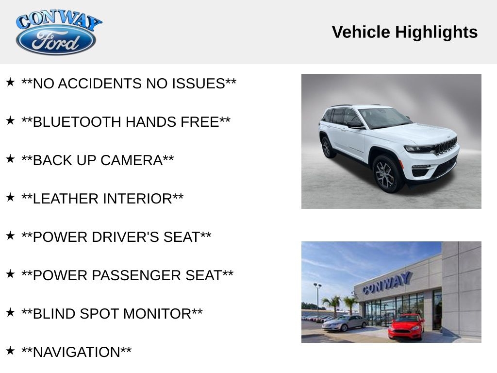 **NO ACCIDENTS NO ISSUES**, **BLUETOOTH HANDS FREE**, **BACK UP CAMERA**, **LEATHER INTERIOR**, **POWER DRIVER'S SEAT**, **POWER PASSENGER SEAT**, **BLIND SPOT MONITOR**, **NAVIGATION**, **BALANCE OF FACTORY WARRANTY**, **FULLY SERVICED AND DETAILED**, Apple Carplay-Android Auto, Remote Start, Adaptive Cruise Control, Heated Front and 2nd Row Seating, Power Liftgate, Grand Cherokee Limited, 4D Sport Utility, 3.6L V6 24V VVT, 4WD, Bright White Clearcoat, Global Black Artificial Leather, 4-Wheel Disc Brakes, ABS brakes, Adaptive Cruise Control, Air Conditioning, AM/FM radio: SiriusXM with 360L, Auto High-beam Headlights, Automatic temperature control, Brake assist, Bumpers: body-color, Capri Leatherette Seats, Compass, Delay-off headlights, Driver door bin, Driver vanity mirror, Dual front impact airbags, Dual front side impact airbags, Dual Zone Auto A/C, Electronic Stability Control, Four wheel independent suspension, Front Bucket Seats, Front reading lights, Garage door transmitter, Heated door mirrors, Heated Rear Seats, Heated Seats, Heated steering wheel, Knee airbag, Low tire pressure warning, Memory seat, Navigation System, Outside temperature display, Panic alarm, ParkView Rear Back-Up Camera, Passenger door bin, Passenger vanity mirror, Power door mirrors, Power driver seat, Power Liftgate, Power passenger seat, Power windows, Quick Order Package 23E, Radio data system, Radio: Uconnect 5 Nav w/10.1" Display, Rear reading lights, Rear window defroster, Rear window wiper, Remote keyless entry, Spoiler, Steering wheel mounted audio controls, Tachometer, Telescoping steering wheel, Traction control, Trip computer, Variably intermittent wipers, Wheels: 18" x 8" Polished/Painted Aluminum. Priced below KBB Fair Purchase Price!