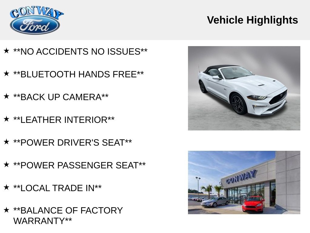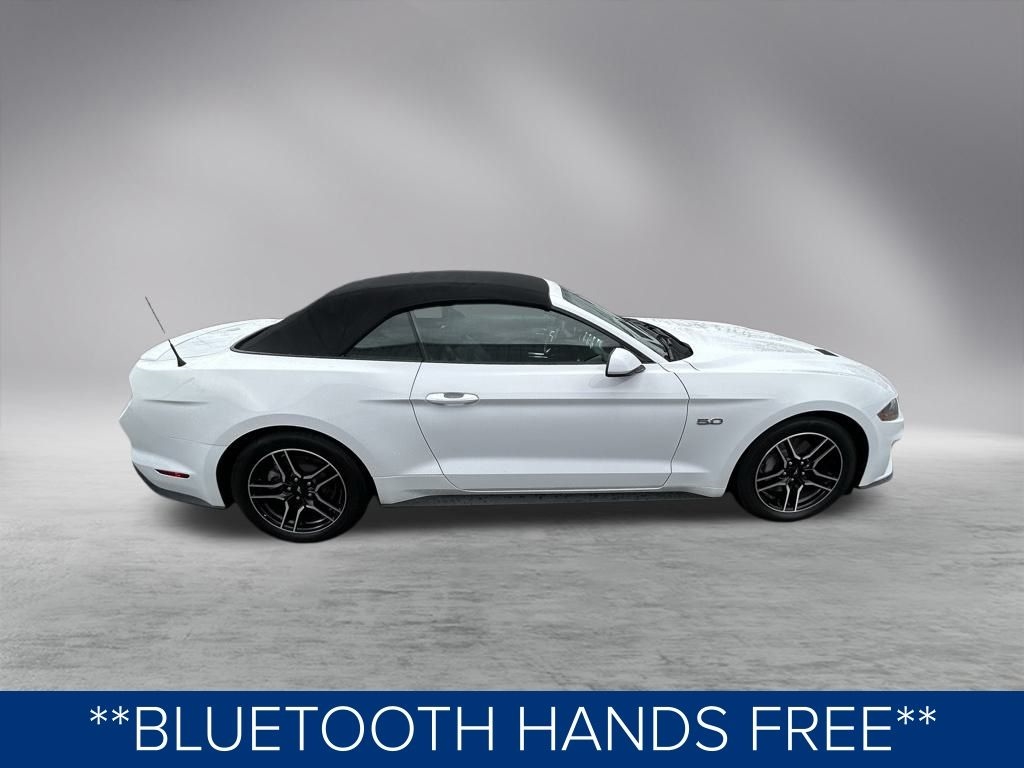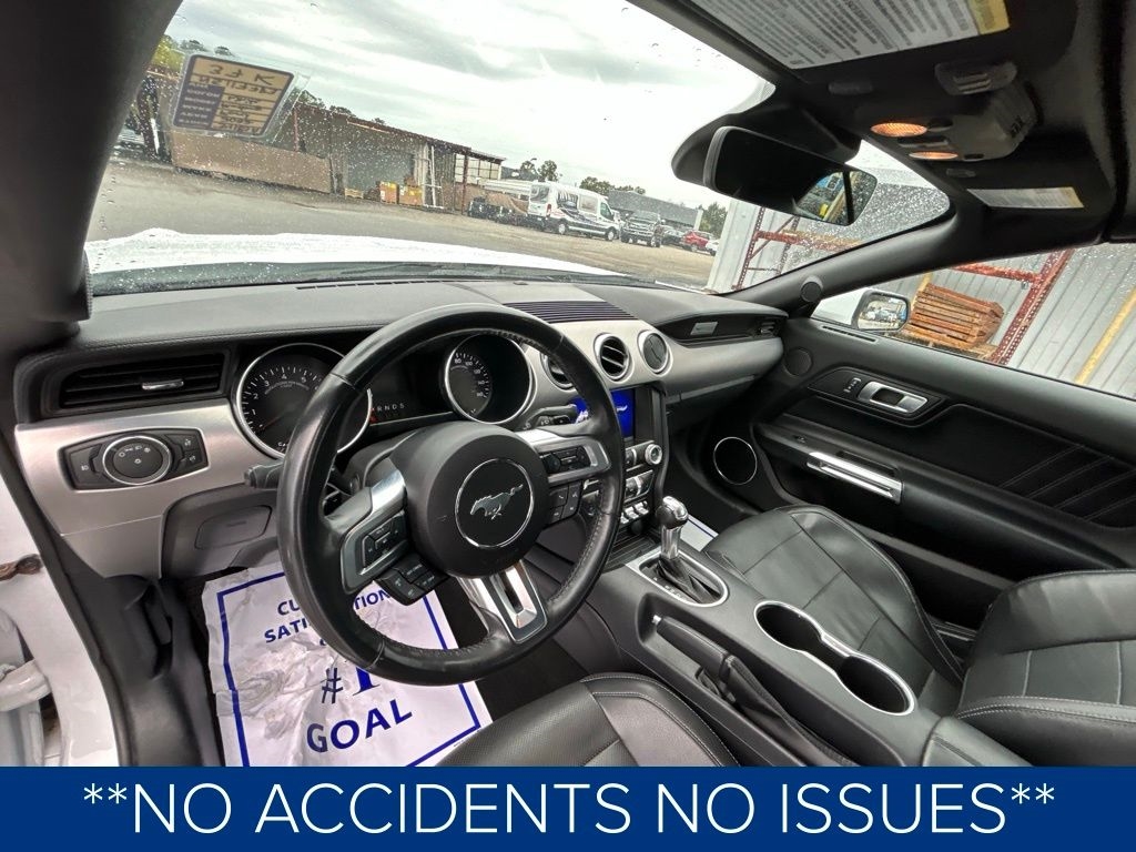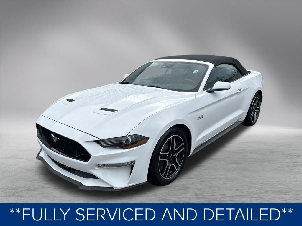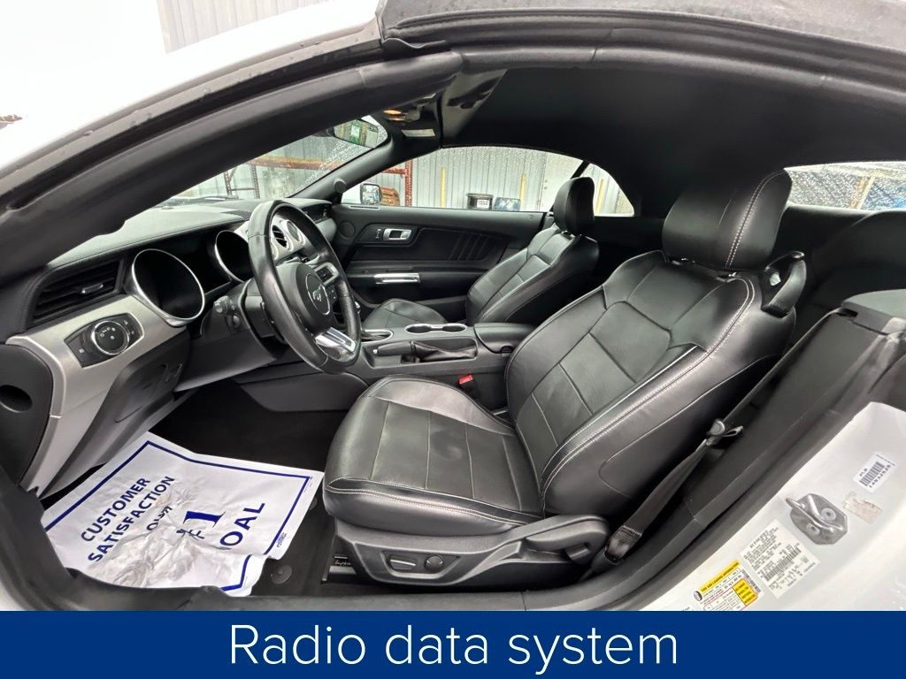 **NO ACCIDENTS NO ISSUES**, **BLUETOOTH HANDS FREE**, **BACK UP CAMERA**, **LEATHER INTERIOR**, **POWER DRIVER'S SEAT**, **POWER PASSENGER SEAT**, **LOCAL TRADE IN**, **BALANCE OF FACTORY WARRANTY**, **FULLY SERVICED AND DETAILED**, Apple Carplay-Android Auto, FordPass Connect, Ford CoPilot360, Rear Parking Sensors, Heated and Cooled Front Seats, Mustang GT Premium, 2D Convertible, 5.0L V8 Ti-VCT, Oxford White, Ebony w/Leather-Trimmed Bucket Seats, 3.15 Limited Slip Rear Axle Ratio, 4-Wheel Disc Brakes, ABS brakes, Air Conditioning, AM/FM radio: SiriusXM, Auto High-beam Headlights, Automatic temperature control, Brake assist, Bumpers: body-color, Climate Controlled Heated/Cooled Front Seats, Compass, Convertible roof lining, Cruise Control, Delay-off headlights, Driver door bin, Driver vanity mirror, Dual front impact airbags, Dual front side impact airbags, Dual Zone Auto A/C, Electronic Stability Control, Equipment Group 400A, Exterior Parking Camera Rear, Four wheel independent suspension, Front fog lights, Front reading lights, Fully automatic headlights, Garage door transmitter, Glass rear window, Heated door mirrors, Heated Seats, Knee airbag, Leather Shift Knob, Leather-Trimmed Bucket Seats, Low tire pressure warning, Outside temperature display, Passenger door bin, Passenger vanity mirror, Power convertible roof, Power door mirrors, Power driver seat, Power windows, Radio data system, Rain sensing wipers, Rear Parking Sensors, Rear window defroster, Remote keyless entry, SiriusXM Radio, Spoiler, Steering wheel mounted audio controls, SYNC 3 Communications & Entertainment System, Tachometer, Telescoping steering wheel, Traction control, Trip computer, Variably intermittent wipers, Wheels: 18" x 8" Machined-Face Aluminum.