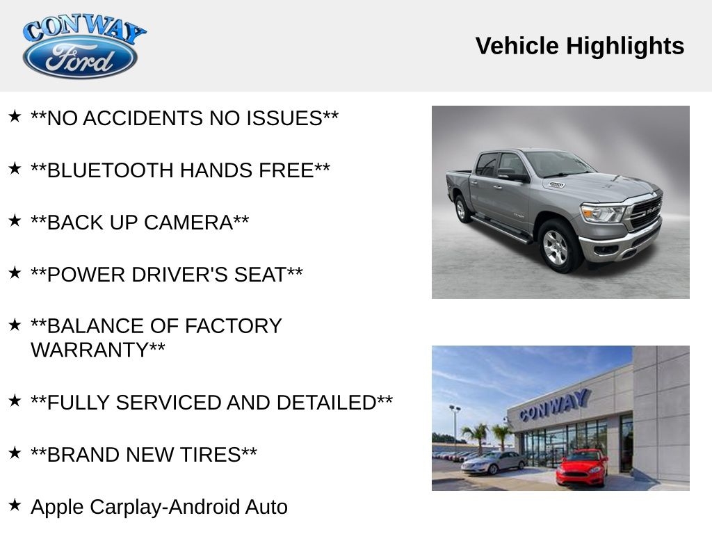 **NO ACCIDENTS NO ISSUES**, **BLUETOOTH HANDS FREE**, **BACK UP CAMERA**, **POWER DRIVER'S SEAT**, **BALANCE OF FACTORY WARRANTY**, **FULLY SERVICED AND DETAILED**, **BRAND NEW TIRES**, Apple Carplay-Android Auto, Remote Start, Power Adjustable Pedals, Rear Power Sliding Window, Class IV Trailer Hitch, Satellite Radio, 1500 Big Horn/Lone Star, 4D Crew Cab, HEMI 5.7L V8 Multi Displacement VVT, Billet Silver Metallic Clearcoat, Black Cloth, 2nd Row In Floor Storage Bins, 4-Wheel Disc Brakes, ABS brakes, Air Conditioning, Anti-Spin Differential Rear Axle, Auto-Dimming Exterior Driver Mirror, Auto-Dimming Rear-View Mirror, Big Horn Badge, Big Horn Level 1 Equipment Group, Black Premium Power Mirrors, Brake assist, Bucket Seats, Bumpers: chrome, Class IV Receiver Hitch, Cluster 3.5" TFT Color Display, Compass, Cruise Control, Delay-off headlights, Driver door bin, Dual front impact airbags, Dual front side impact airbags, Electronic Stability Control, Exterior Mirrors Courtesy Lamps, Exterior Mirrors w/Supplemental Signals, Foam Bottle Insert (Door Trim Panel), For More Info, Call 800-643-2112, Front fog lights, Front reading lights, Front wheel independent suspension, Fully automatic headlights, Glove Box Lamp, Heated door mirrors, Integrated Voice Command w/Bluetooth, Leather steering wheel, Low tire pressure warning, Outside temperature display, Panic alarm, ParkView Rear Back-Up Camera, Passenger door bin, Power 4-Way Driver Lumbar Adjust, Power 8-Way Driver Seat, Power Adjustable Pedals, Power door mirrors, Power windows, Power-Folding Mirrors, Quick Order Package 25Z Big Horn (DISC), Radio data system, Radio: Uconnect 4 w/8.4" Display, Rear Dome w/On/Off Switch Lamp, Rear Power Sliding Window, Rear Window Defroster, Remote keyless entry, SiriusXM Radio Service, SiriusXM Satellite Radio, Steering wheel mounted audio controls, Sun Visors w/Illuminated Vanity Mirrors, Tachometer, Telescoping steering wheel, Traction control, Trip computer, Universal Garage Door Opener, Variably intermittent wipers, Wheels: 18" x 8" Cast-Aluminum Painted. Priced below KBB Fair Purchase Price!