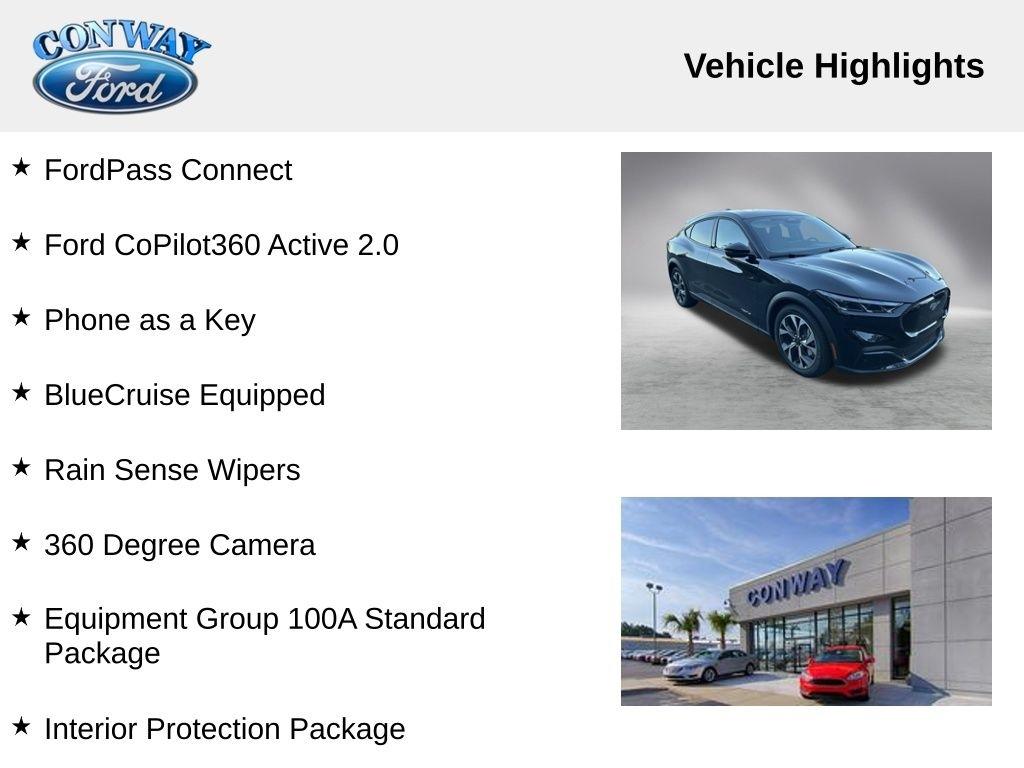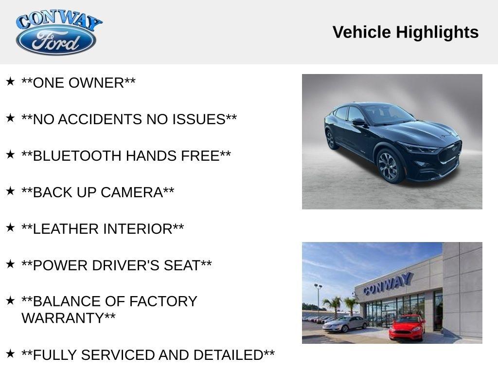 **ONE OWNER**, **NO ACCIDENTS NO ISSUES**, **BLUETOOTH HANDS FREE**, **BACK UP CAMERA**, **LEATHER INTERIOR**, **POWER DRIVER'S SEAT**, **BALANCE OF FACTORY WARRANTY**, **FULLY SERVICED AND DETAILED**, FordPass Connect, Ford CoPilot360 Active 2.0, Phone as a Key, BlueCruise Equipped, Rain Sense Wipers, 360 Degree Camera, Mustang Mach-E Select, 4D Sport Utility, Electric Motor, RWD, Shadow Black, Black Onyx Premium Synthetic, 1st & 2nd Row Floor Liners w/o Carpet Mats, 4-Wheel Disc Brakes, ABS brakes, Air Conditioning, Auto High-beam Headlights, Automatic temperature control, BlueCruise Equipped (1-Year Plan), Brake assist, Bumpers: body-color, Cargo Area Cover, Cargo Floor Liner, Compass, Cruise Control, Delay-off headlights, Driver door bin, Driver vanity mirror, Dual front impact airbags, Dual front side impact airbags, Dual Zone Auto A/C, Electronic Stability Control, Equipment Group 100A Standard Package, Exterior Parking Camera Rear, Four wheel independent suspension, Front Bucket Seats, Front reading lights, Garage door transmitter, Heated door mirrors, Interior Protection Package, Knee airbag, Low tire pressure warning, Outside temperature display, Panic alarm, Passenger door bin, Power door mirrors, Power driver seat, Power windows, Radio data system, Rain sensing wipers, Rear window defroster, Rear window wiper, Remote keyless entry, SiriusXM w/360L, Steering wheel mounted audio controls, SYNC 4A w/Enhanced Voice Recognition, Telescoping steering wheel, Trip computer, Turn signal indicator mirrors, Variably intermittent wipers, Wheels: 19" Machined-Face Aluminum.