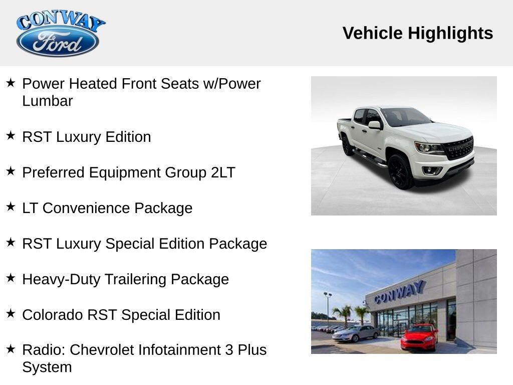 **BLUETOOTH HANDS FREE**, **BACK UP CAMERA**, **LEATHER INTERIOR**, **POWER DRIVER'S SEAT**, **POWER PASSENGER SEAT**, **FULLY SERVICED AND DETAILED**, Apple Carplay-Android Auto, Remote Start, Power Heated Front Seats w/Power Lumbar, RST Luxury Edition, Colorado LT RST Special Edition, 4D Crew Cab, V6, Summit White, Black Leather, 4-Way Power Front Passenger Seat Adjuster, 4-Wheel Disc Brakes, 6-Speaker Audio System Feature, ABS brakes, AM/FM radio: SiriusXM, Apple CarPlay, Automatic Locking Rear Differential, Black Beltline Moldings, Black Body Side Moldings (LPO), Black Colorado Rear Emblem (LPO), Black Spray-On Bedliner w/Chevrolet Logo, Colorado RST Special Edition, Cruise Control, Delay-off headlights, Driver door bin, Driver vanity mirror, Dual front impact airbags, Dual front side impact airbags, Electronic Stability Control, Exterior Parking Camera Rear, EZ-Lift & Lower Tailgate, Front Fog Lamps, Front reading lights, Front wheel independent suspension, HD Radio, Heated Driver & Front Passenger Seats, Heated Steering Wheel, Heated Steering Wheel (DISC), Heavy-Duty Trailering Package, Inside Rear-View Auto-Dimming Mirror, Low tire pressure warning, LT Convenience Package, Manual Rear-Sliding Window, Outside Heated Power-Adjustable Body-Color Mirrors, Panic alarm, Passenger door bin, Power door mirrors, Power Driver Lumbar Control Seat Adjuster, Power driver seat, Power Passenger Lumbar Control Seat Adjuster, Power windows, Preferred Equipment Group 2LT, Premium audio system: Chevrolet Infotainment System, Projector-Type Headlamps, Radio data system, Radio: Chevrolet Infotainment 3 Plus System, Rear-Window Electric Defogger, Remote keyless entry, Remote Vehicle Starter System, RST Badge (LPO), RST Luxury Special Edition Package, Single-Zone Auto Climate Control Air Conditioning, SiriusXM Radio, Steering wheel mounted audio controls, Tachometer, Telescoping steering wheel, Tow/Haul Mode, Traction control, Variably intermittent wipers, Wheels: 20" Low Gloss Black Aluminum.