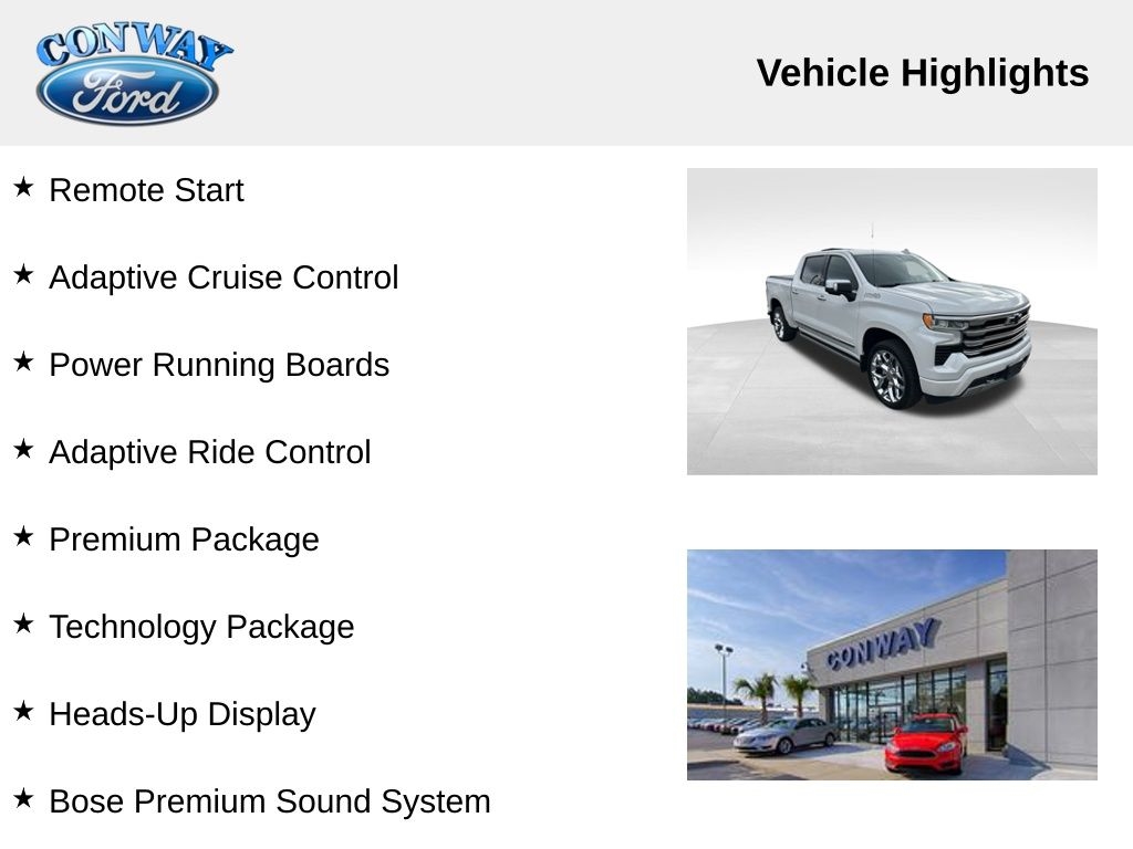 Additionally, this Silverado is equipped with a host of advanced technology and convenience features, including Apple CarPlay, Android Auto, remote start, adaptive cruise control, and a premium Bose sound system. The High Country Premium Package, Technology Package, and Adaptive Ride Control Suspension further elevate the driving experience, providing unparalleled comfort, control, and connectivity.