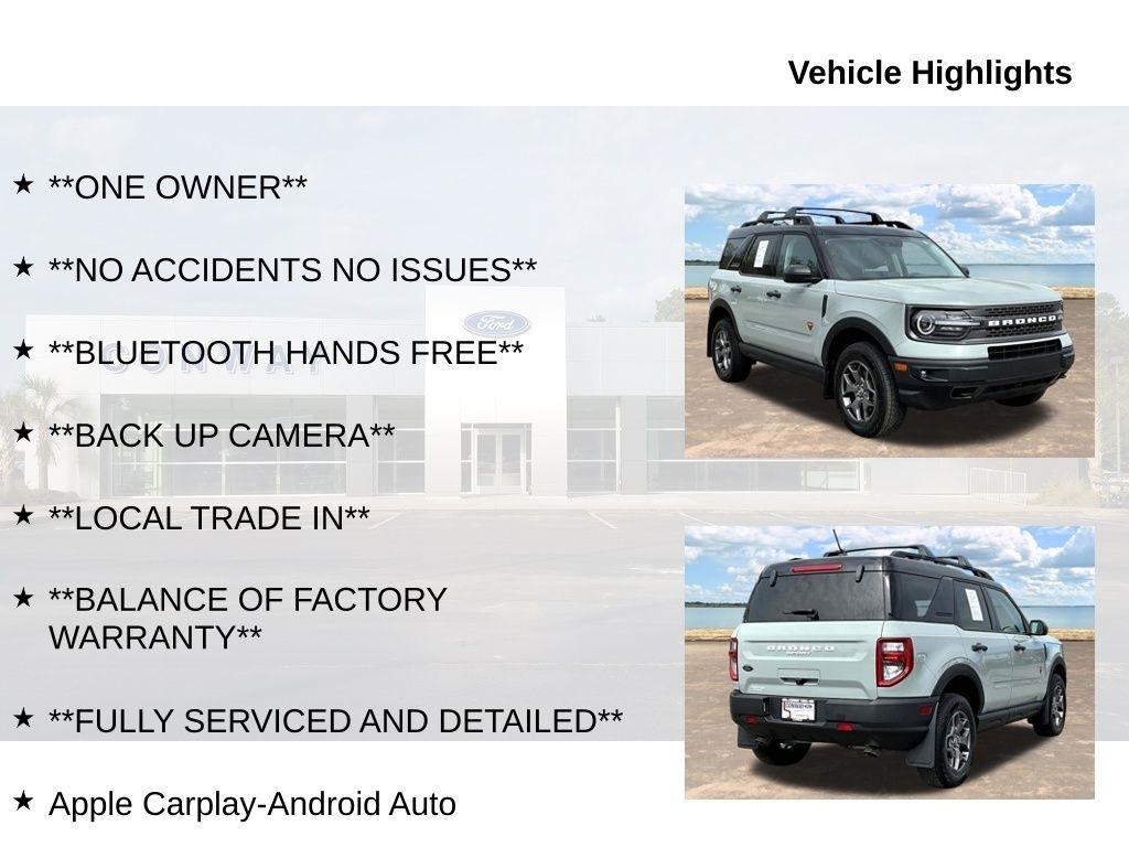 **ONE OWNER**, **NO ACCIDENTS NO ISSUES**, **BLUETOOTH HANDS FREE**, **BACK UP CAMERA**, **LOCAL TRADE IN**, **BALANCE OF FACTORY WARRANTY**, **FULLY SERVICED AND DETAILED**, Apple Carplay-Android Auto, Illuminated Door Entry Keypad, Roof-Rail Crossbars II, FORD CO-PILOT360, FORDPASS CONNECT, OFF-ROAD SUSPENSION, PADDLE SHIFTERS, TRAIL CONTROL, FRONT 180 DEGREE CAMERA, Bronco Sport Badlands, 4D Sport Utility, EcoBoost 2.0L I4 GTDi DOHC Turbocharged VCT, 4WD, Cactus, Ebony/Area 51 Cloth, 4-Wheel Disc Brakes, ABS brakes, Air Conditioning, Auto High-beam Headlights, Automatic temperature control, Brake assist, Compass, Cruise Control, Delay-off headlights, Driver door bin, Driver vanity mirror, Dual front impact airbags, Dual front side impact airbags, Electronic Stability Control, Equipment Group 400A, Four wheel independent suspension, Front Bucket Seats, Front fog lights, Front reading lights, Fully automatic headlights, Heated door mirrors, Knee airbag, Low tire pressure warning, Outside temperature display, Panic alarm, Passenger door bin, Passenger vanity mirror, Power door mirrors, Power driver seat, Power windows, Radio data system, Rear window defroster, Rear window wiper, Remote keyless entry, SiriusXM, Steering wheel mounted audio controls, SYNC 3 Communications & Entertainment System, Tachometer, Telescoping steering wheel, Traction control, Trip computer, Unique Style Cloth Sport Contour Bucket Seats, Variably intermittent wipers, Wheels: 17" Carbonized Gray-Painted Aluminum. Priced below KBB Fair Purchase Price!