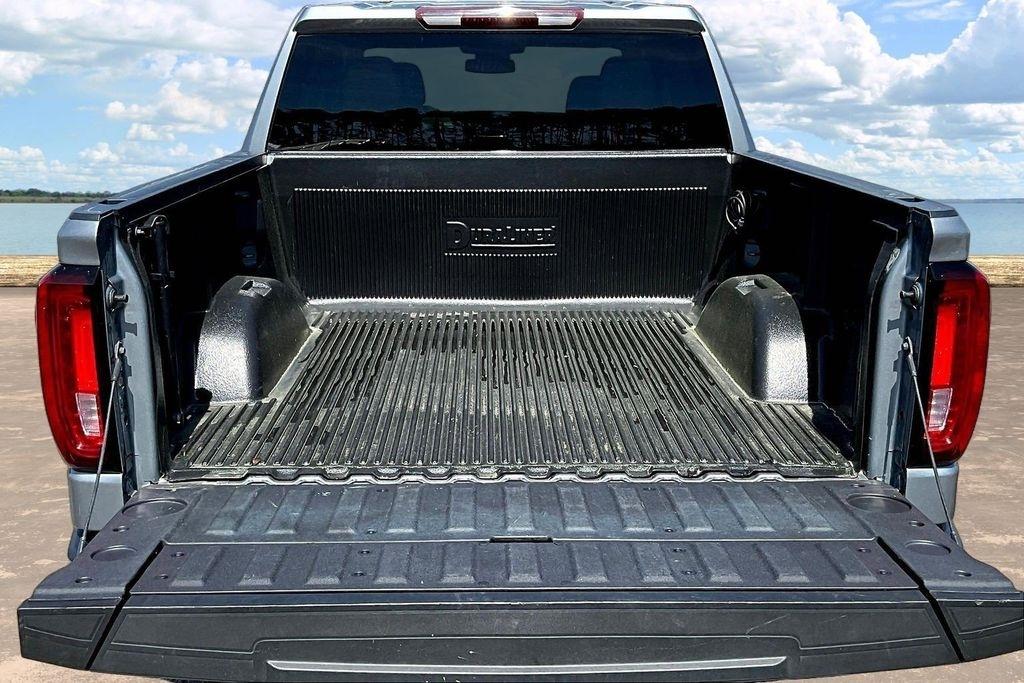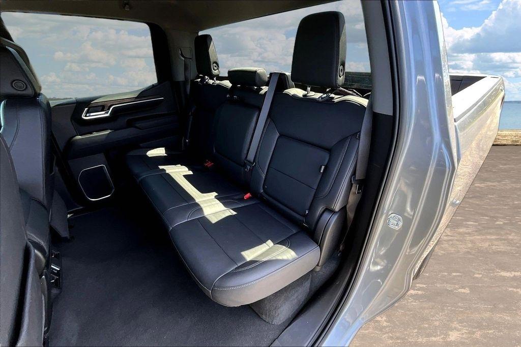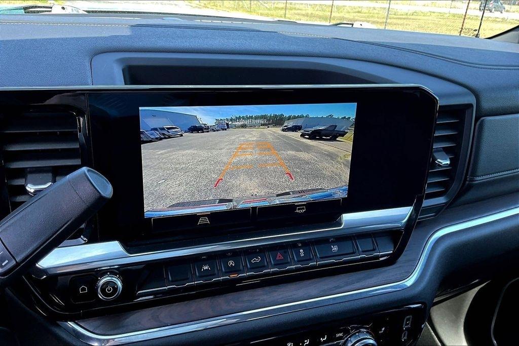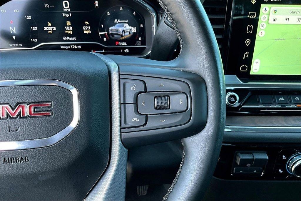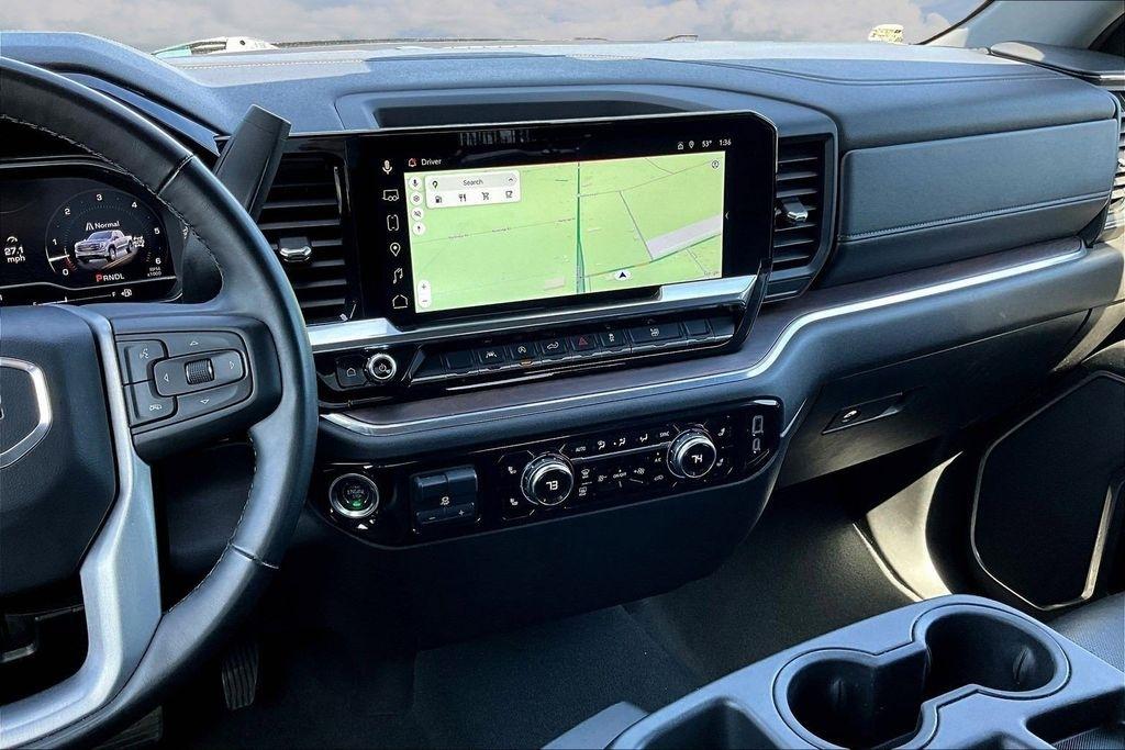 Comfort and convenience are paramount in this Sierra, with dual-zone automatic climate control, a heated steering wheel, and power-adjustable front seats with lumbar support. The leather-appointed seating and premium trim elevate the interior, creating a refined and luxurious environment.