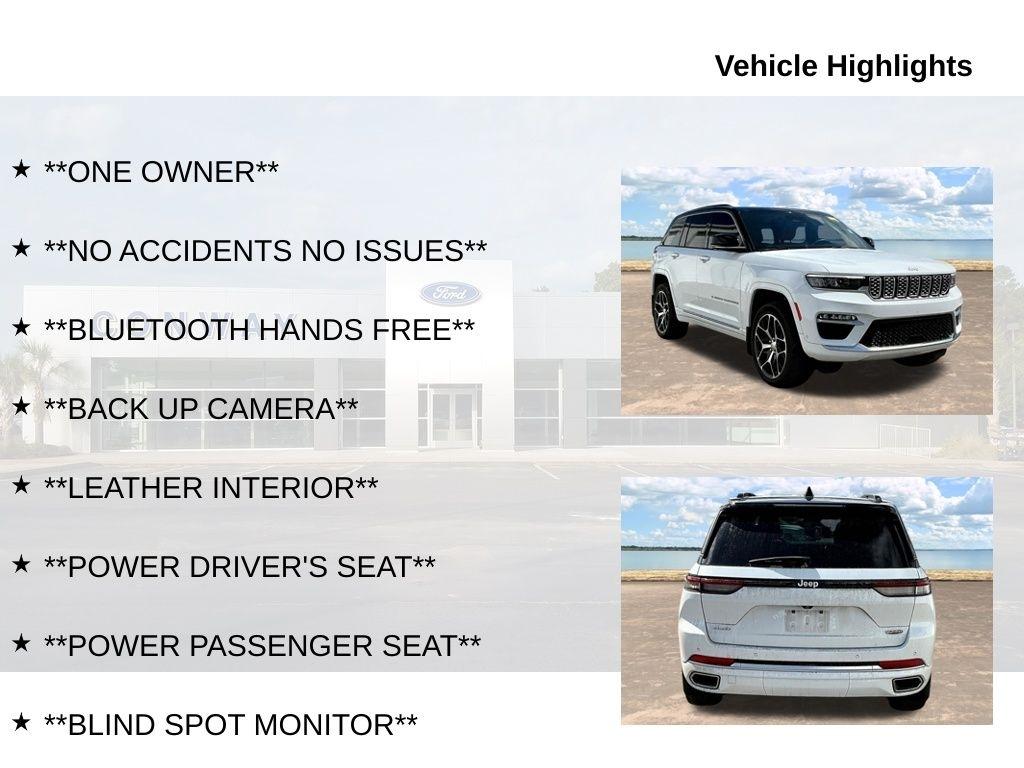 Adorned in a sleek and sophisticated White exterior, this Grand Cherokee Summit boasts an impressive array of premium features that will captivate your senses. Prepare to be amazed by the - Back up camera, Balance of factory warranty, Blind spot monitor, Bluetooth hands-free, Fully serviced and detailed, Leather interior, Local trade-in, Navigation, No accidents or issues, One owner, Power driver's seat, Power passenger seat, and the stunning 950 Watt Amplified 19 Speaker System.