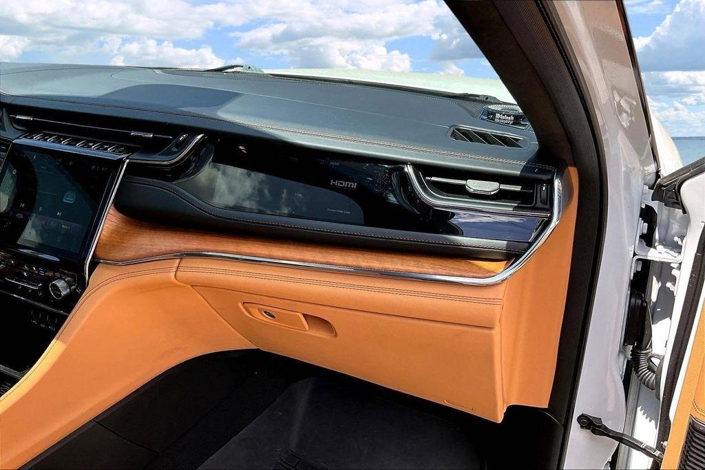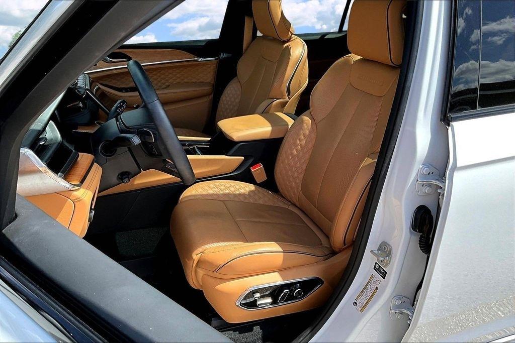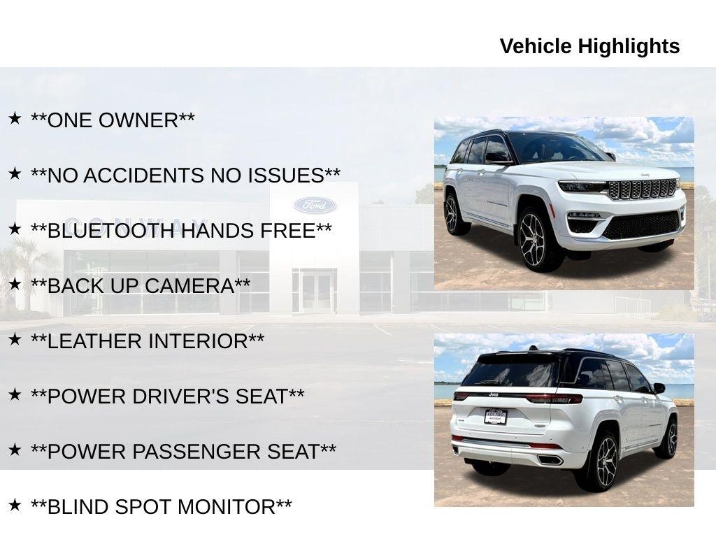Adorned in a sleek and sophisticated White exterior, this Grand Cherokee Summit boasts an impressive array of premium features that will captivate your senses. Prepare to be amazed by the - Back up camera, Balance of factory warranty, Blind spot monitor, Bluetooth hands-free, Fully serviced and detailed, Leather interior, Local trade-in, Navigation, No accidents or issues, One owner, Power driver's seat, Power passenger seat, and the stunning 950 Watt Amplified 19 Speaker System.