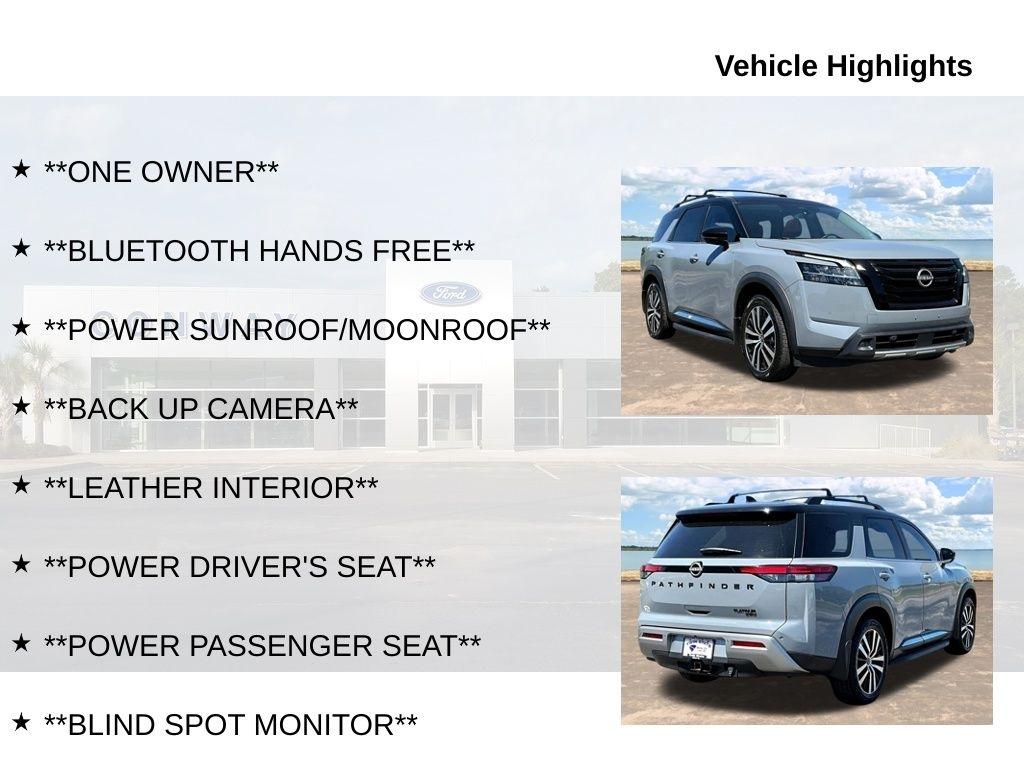 Meticulously equipped with an array of premium features, this Pathfinder Platinum is designed to exceed your expectations. Highlights include - - - Back Up Camera, Blind Spot Monitor, Bluetooth Hands Free, Fully Serviced and Detailed, Leather Interior, Local Trade In, Navigation, One Owner, Power Driver's Seat, Power Passenger Seat, Power Sunroof/Moonroof - - - as well as a Black Appearance Package, Cargo Package, Bose Premium Audio System, Heads-Up Display, Motion Sensing Hands Free Power Liftgate, and much more.